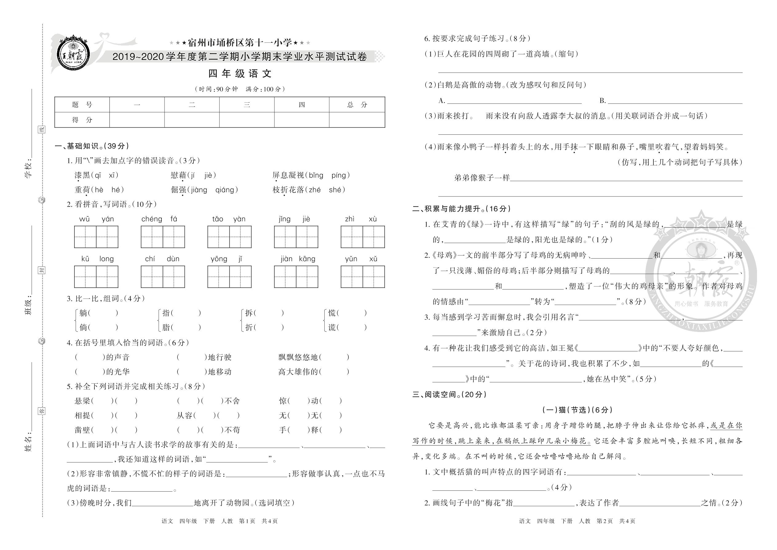 宿州市埇桥区第十一小学2019-2020学年度第二学期小学期末学业水平测试试卷四年级语文(人教版)