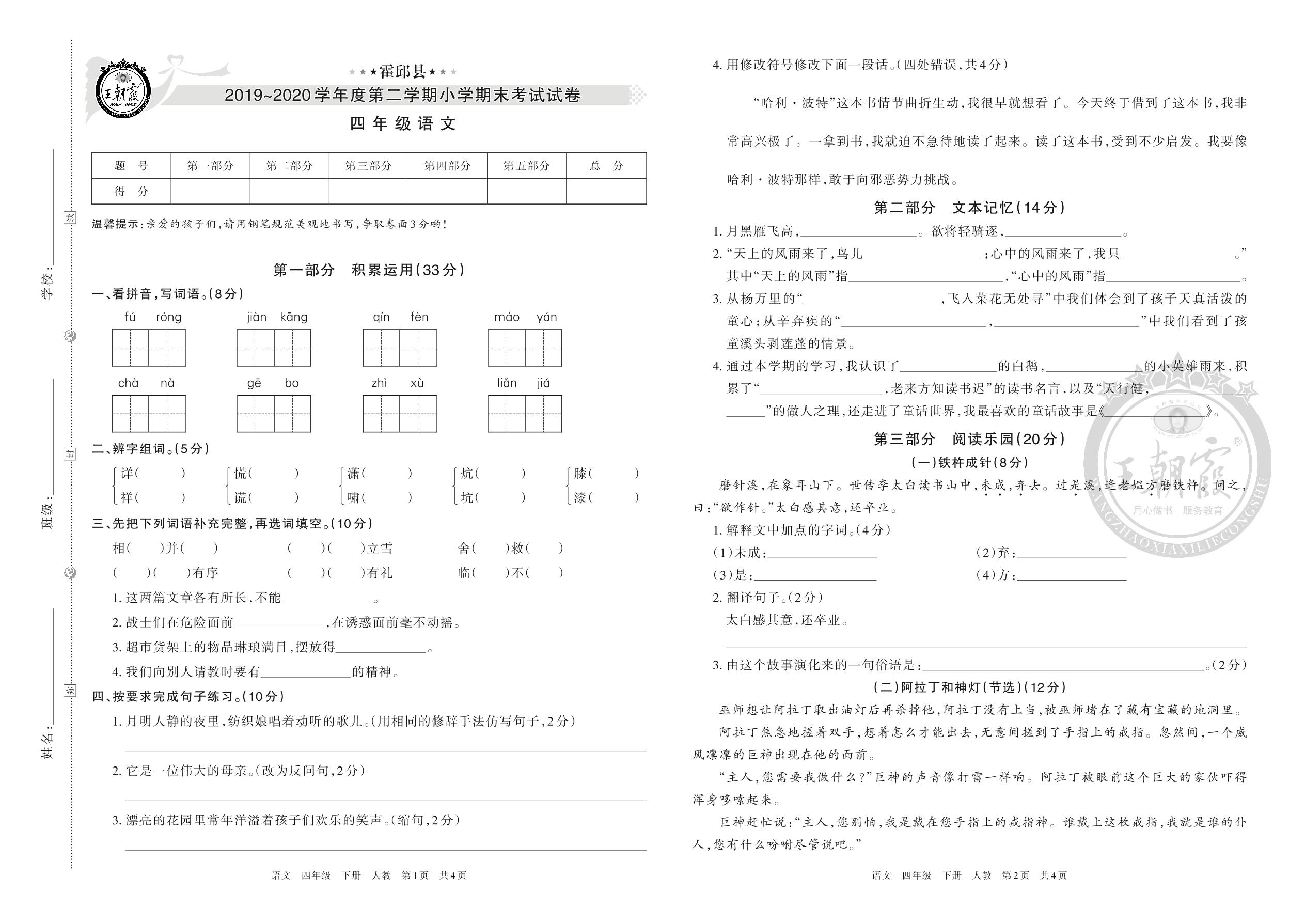 霍邱县2019-2020学年度第二学期小学期末考试试卷四年级语文(人教版)