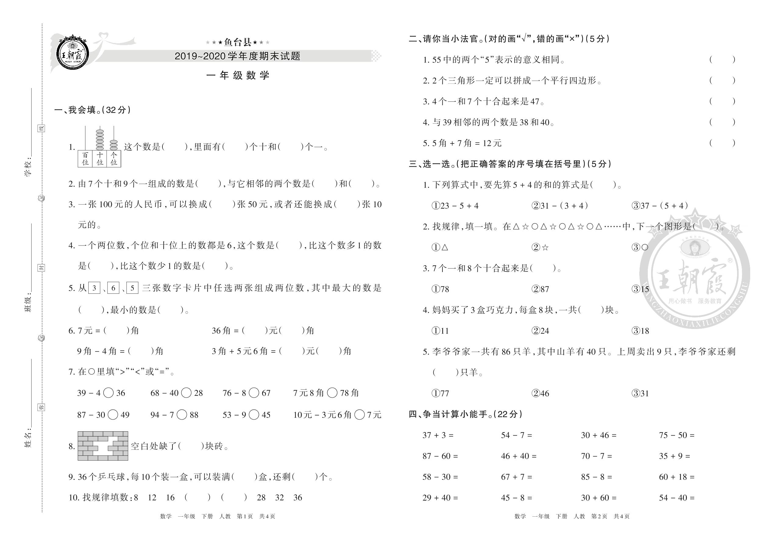 鱼台县2019~2020学年度第二学期期末试题一年级数学(人教版)