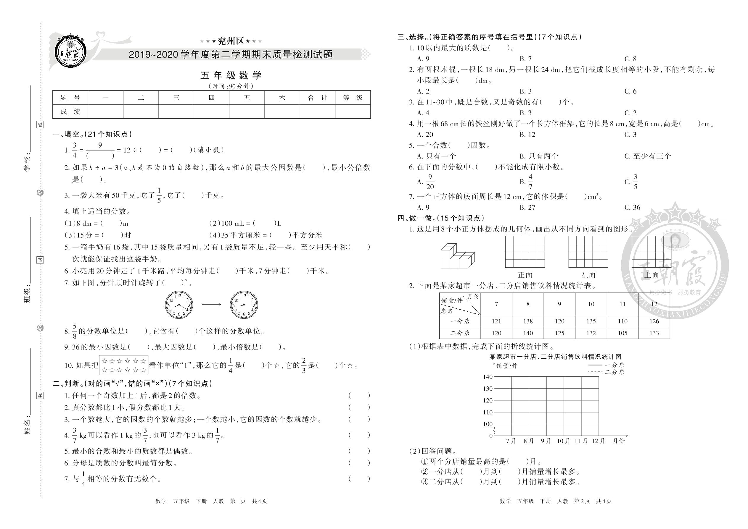 兖州区2019~2020学年度第二学期期末质量检测试题五年级数学(人教版)