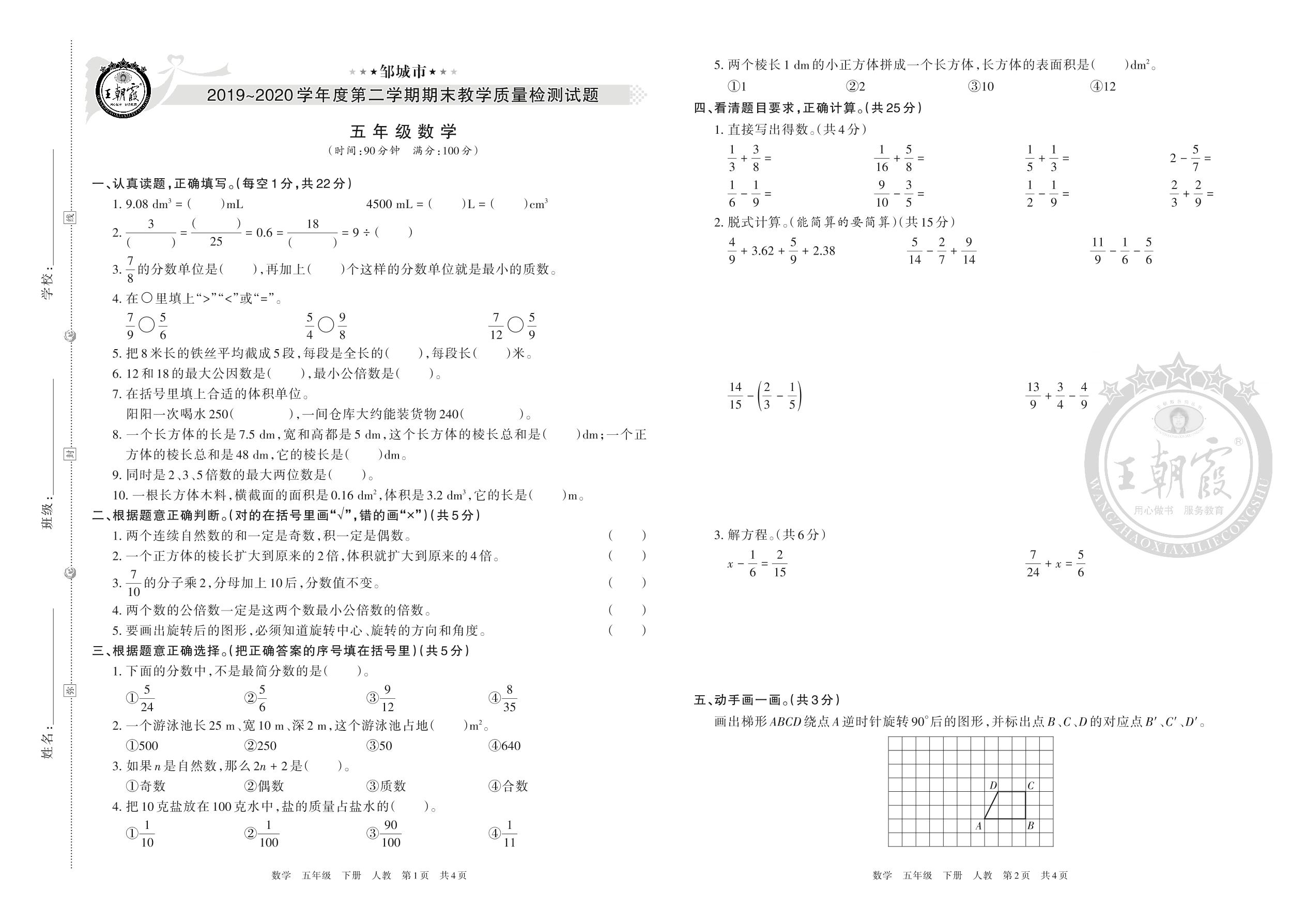 邹城市2019~2020学年度第二学期期末教学质量检测试题五年级数学(人教版)