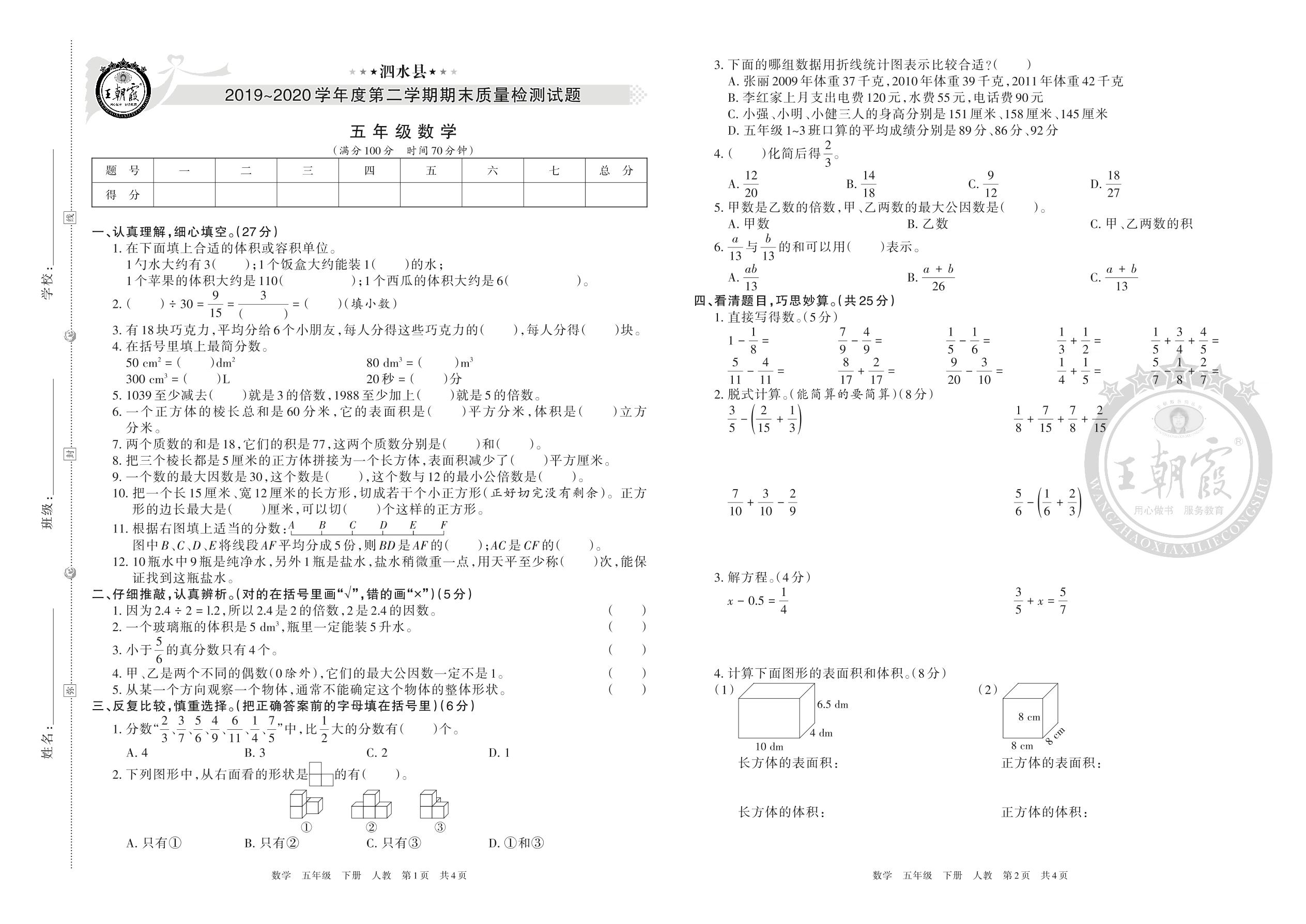 泗水县2019~2020学年度第二学期期末质量检测试题五年级数学(人教版)