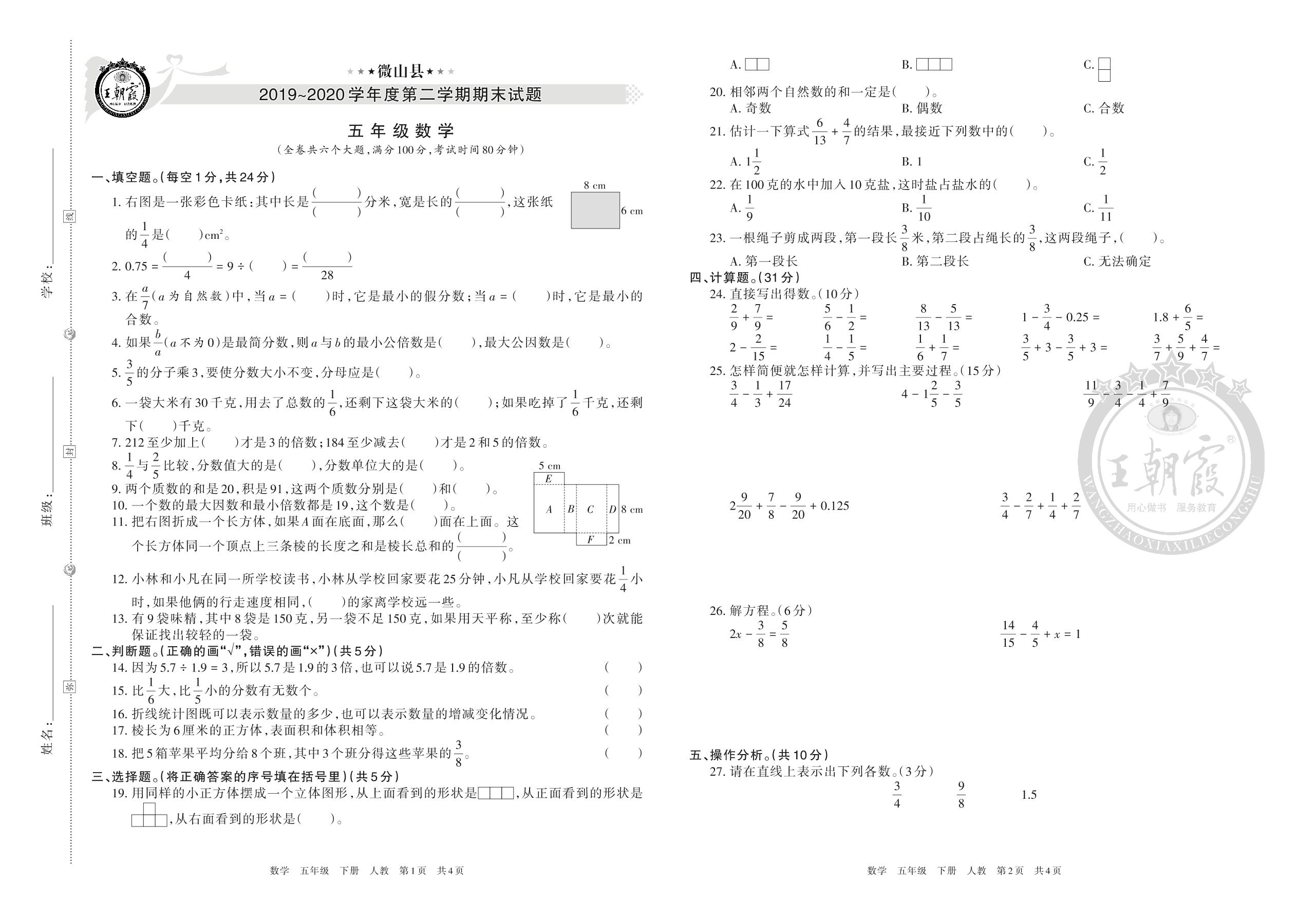 微山县2019~2020学年度第二学期期末试题五年级数学(人教版)