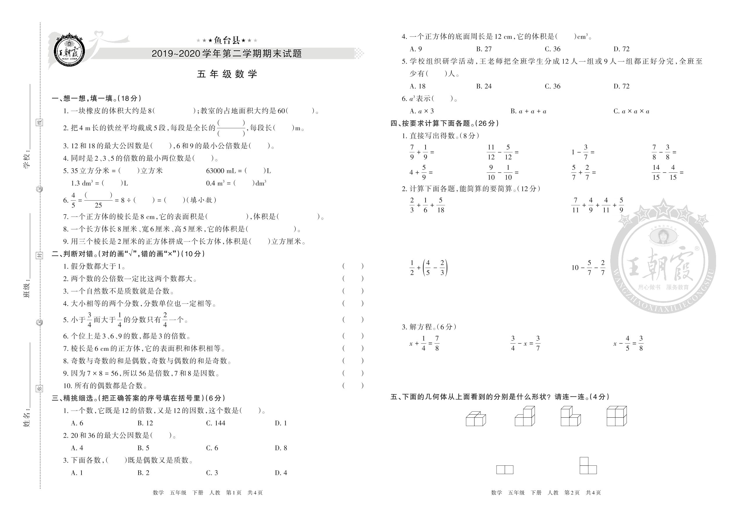 鱼台县2019~2020学年第二学期期末试题五年级数学(人教版)