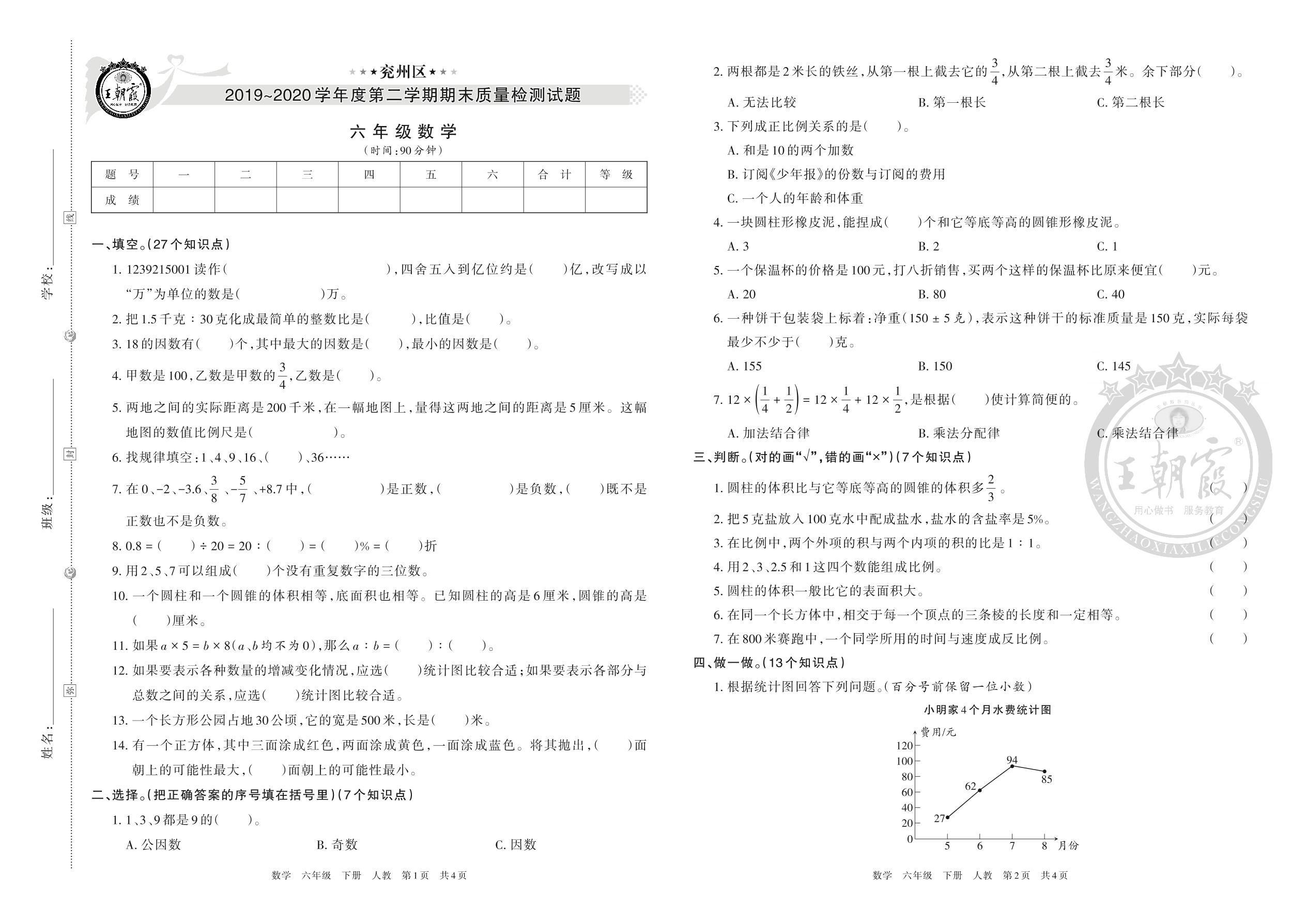 兖州区2019~2020学年度第二学期期末质量检测试题六年级数学(人教版)