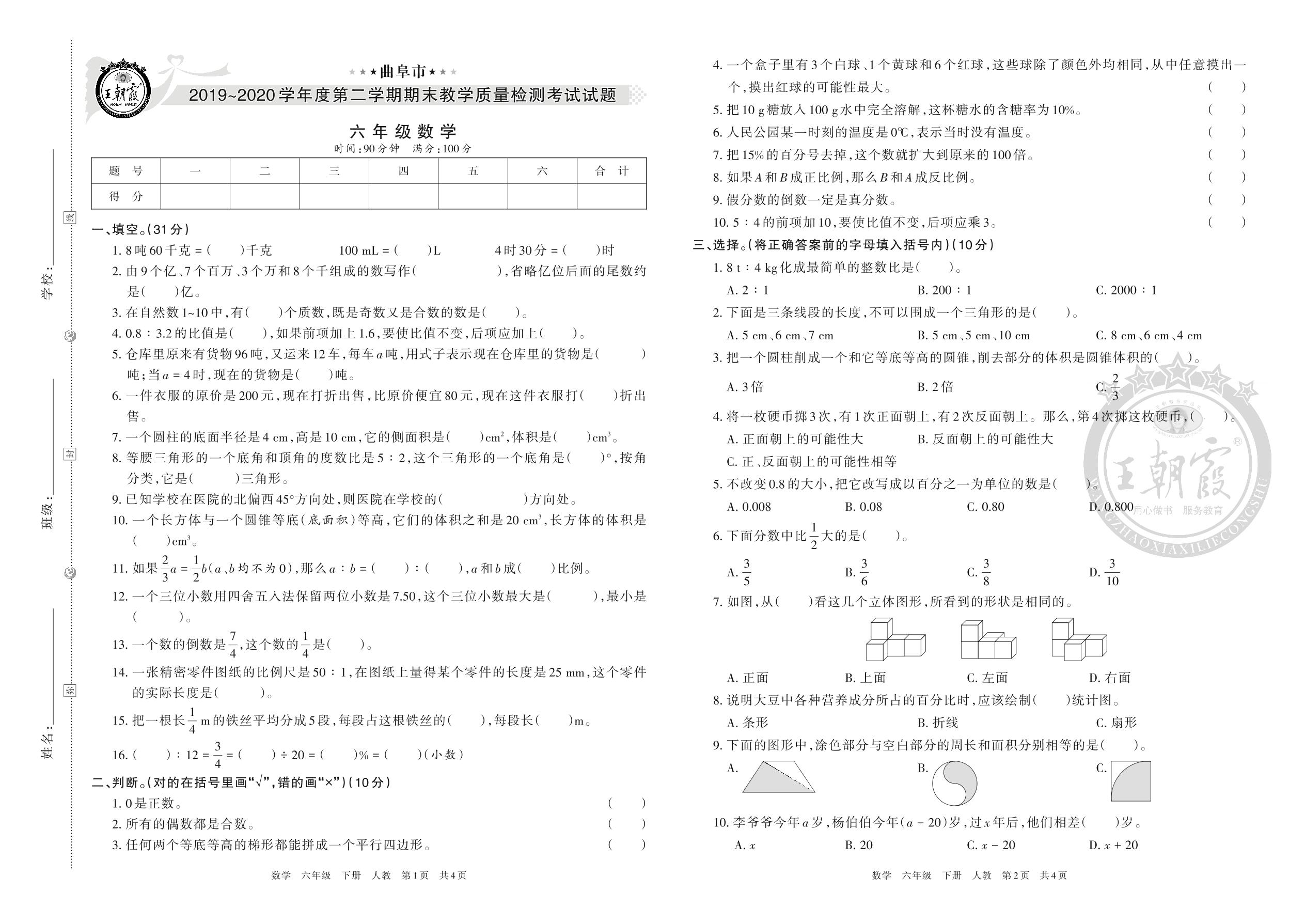 曲阜市2019~2020学年度第二学期期末教学质量检测考试题六年级数学(人教版)
