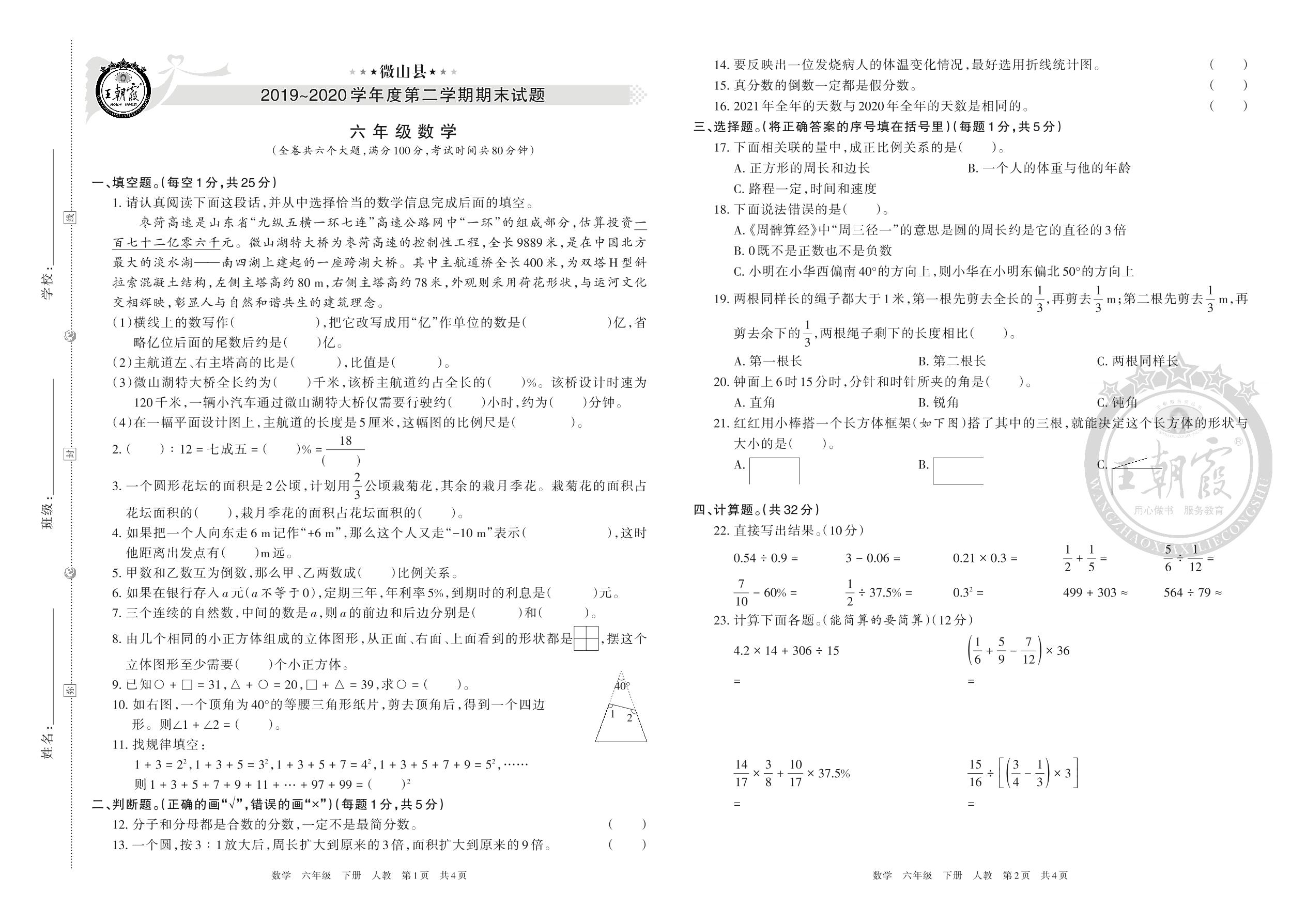 微山县2019~2020学年度第二学期期末试题六年级数学(人教版)
