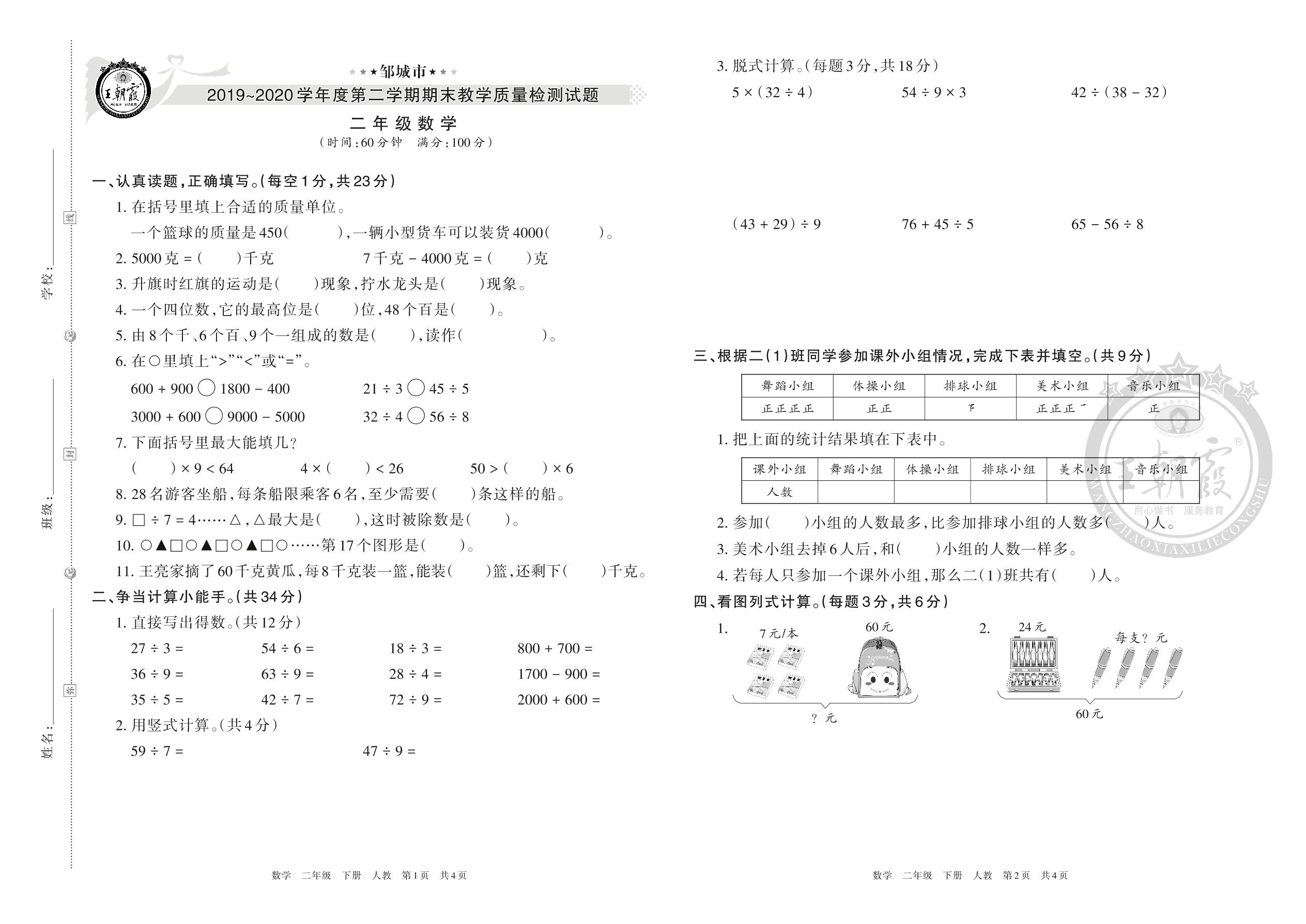 邹城市2019~2020学年度第二学期期末教学质量检测试题二年级数学(人教版)