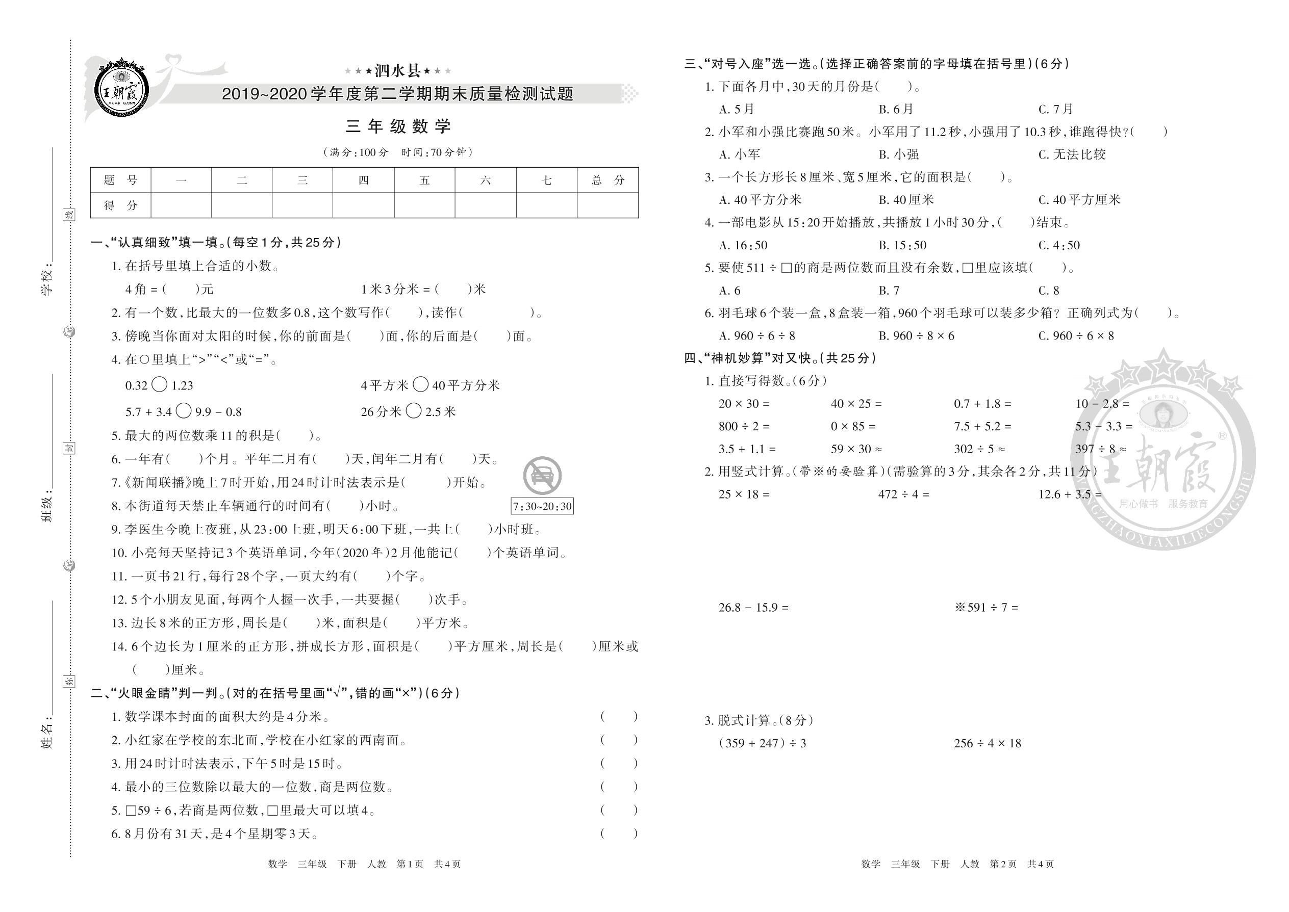 泗水县2019~2020学年度第二学期期末质量检测试题三年级数学(人教版)