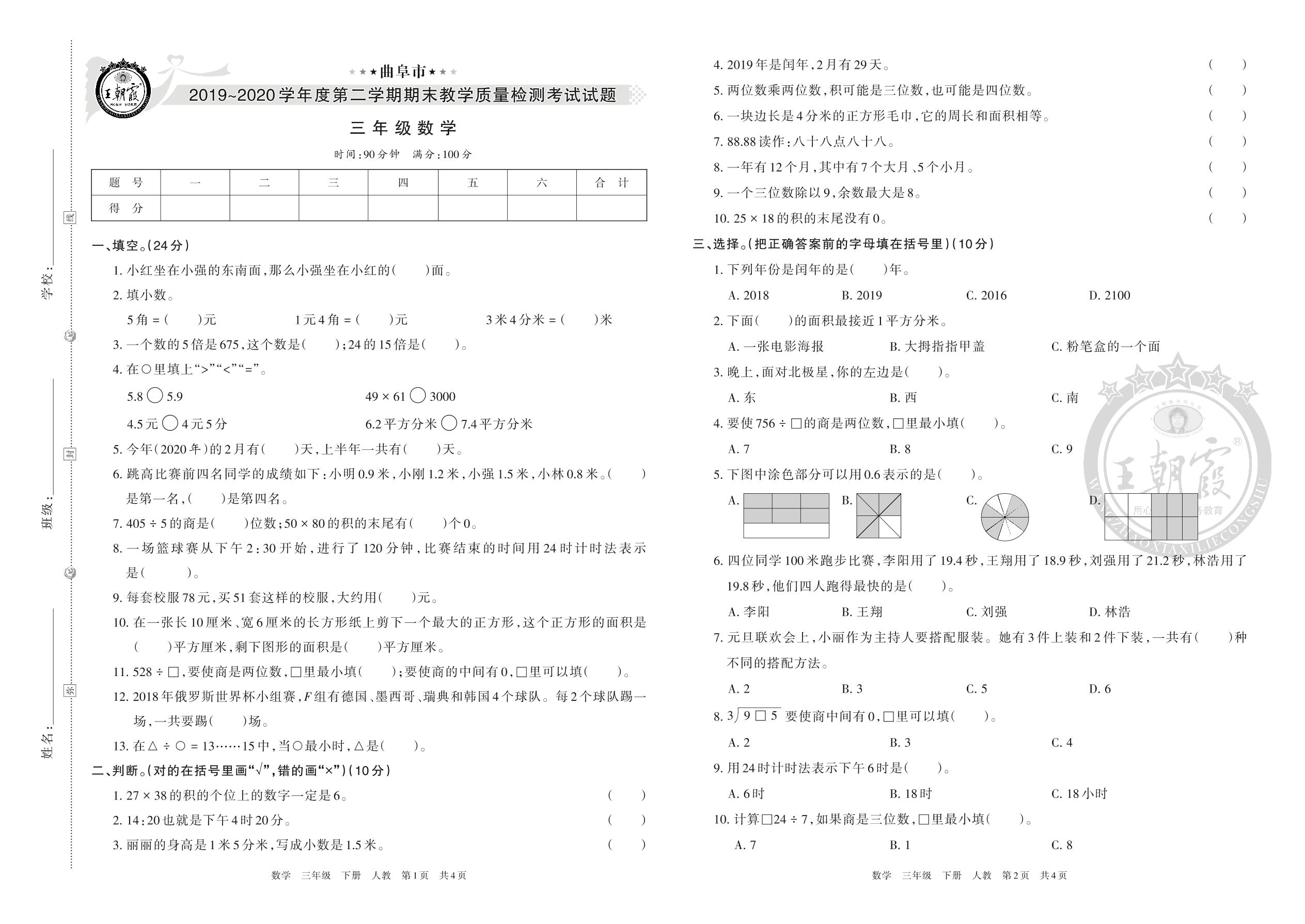 曲阜市2019~2020学年度第二学期期末教学质量检测考试试题三年级数学(人教版)