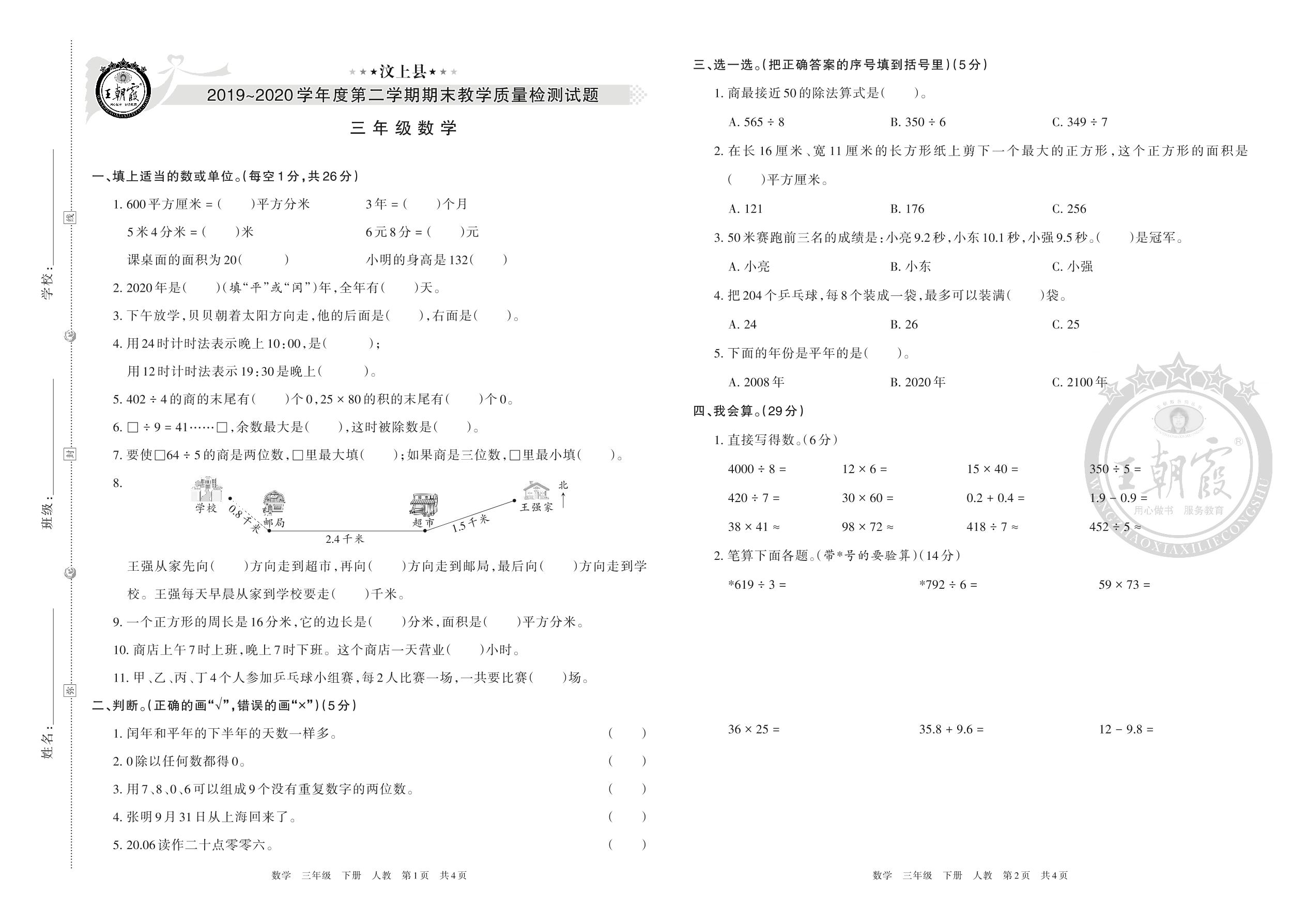 汶上县2019~2020学年度第二学期期末教学质量检测试题三年级数学(人教版)
