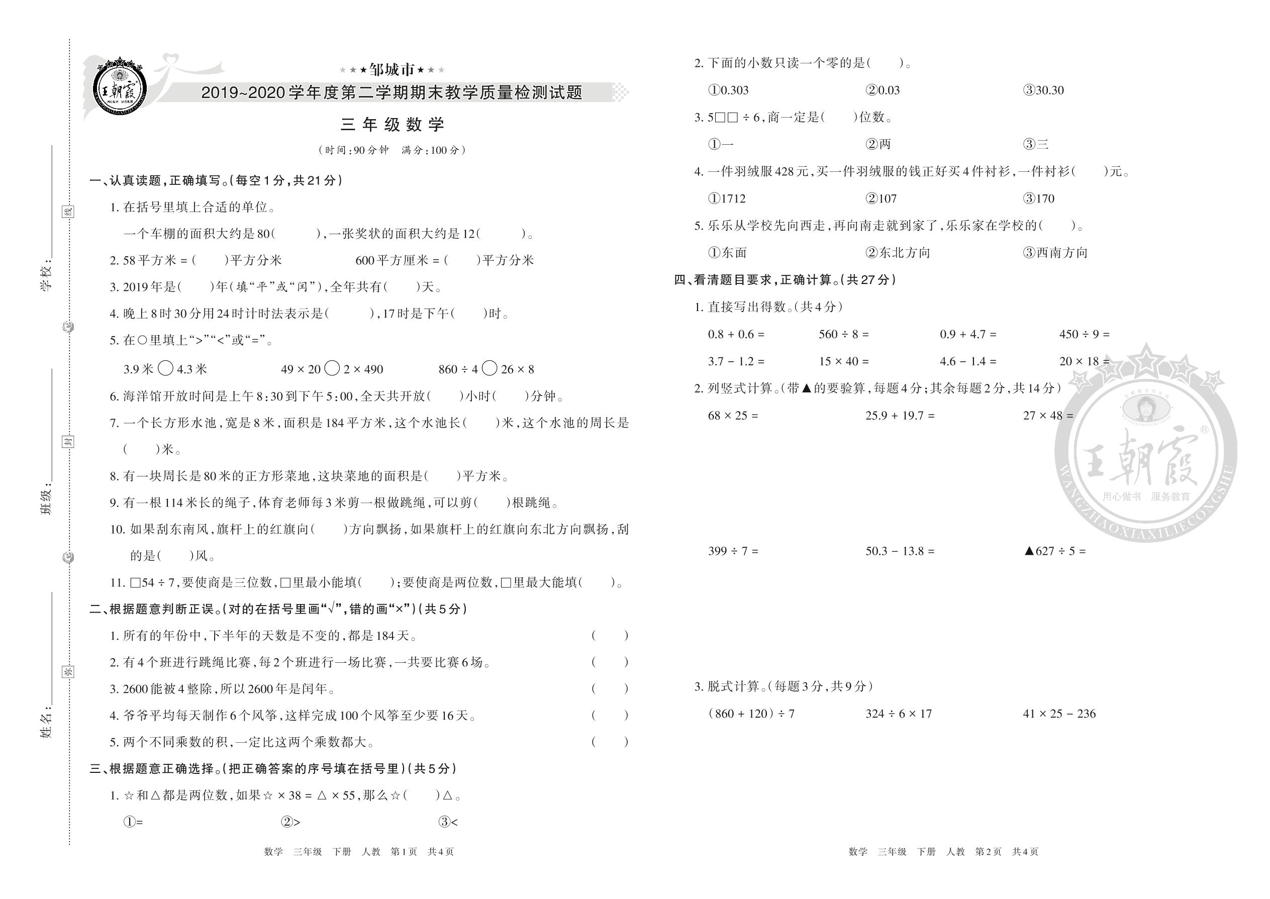 邹城市2019~2020学年度第二学期期末教学质量检测试题三年级数学(人教版)