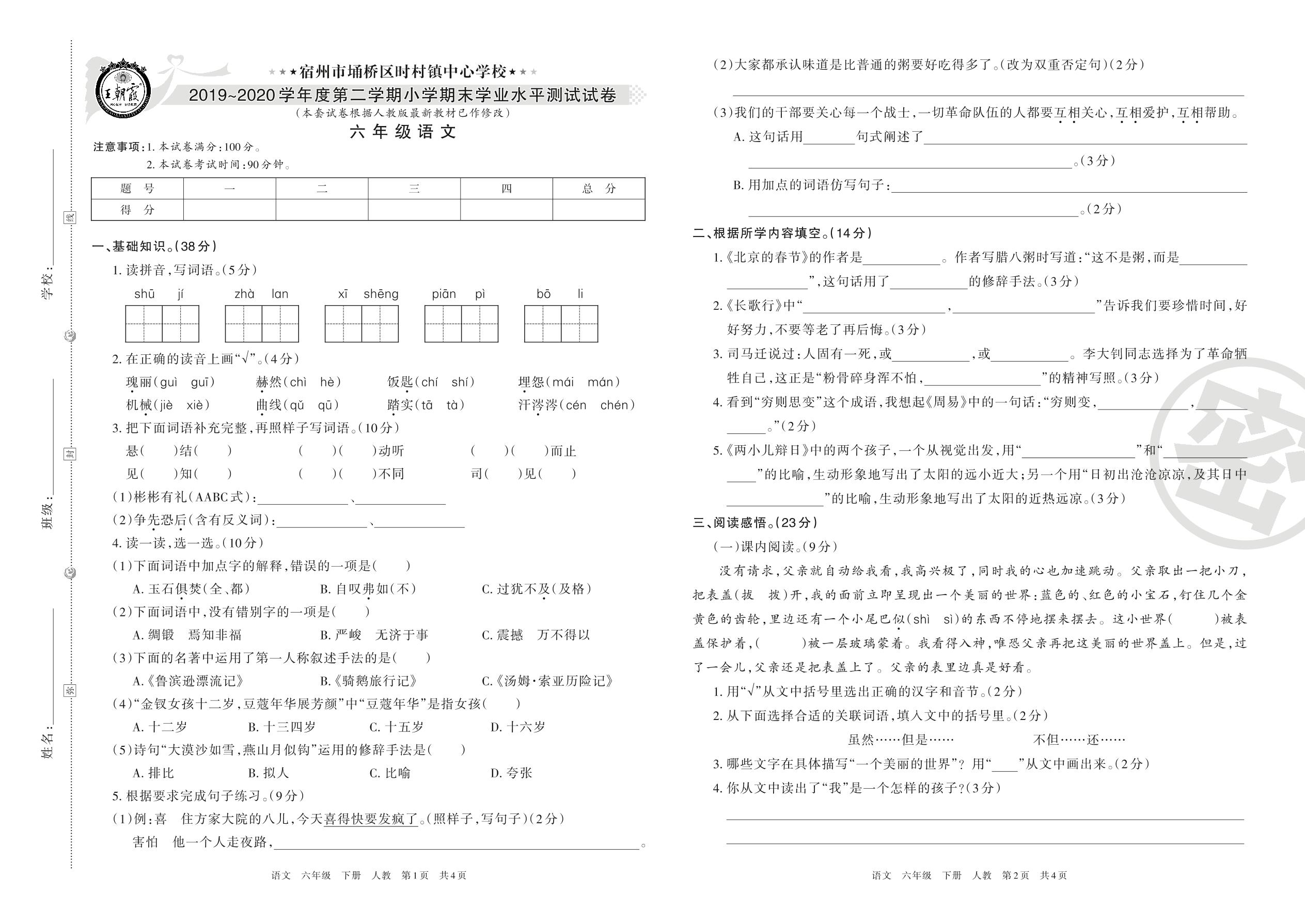 宿州市埇桥区时村镇中心学校2019-2020学年度第二学期小学期末学业水平测试试卷六年级语文(人教版)