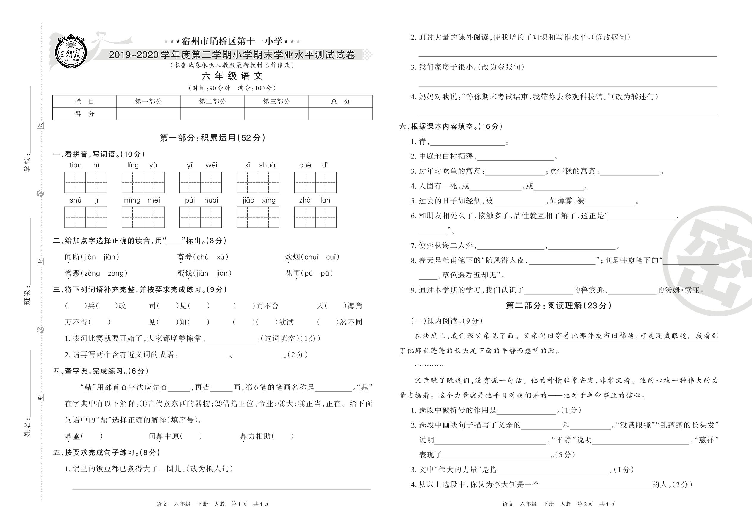 宿州市埇桥区第十一小学2019-2020学年度第二学期小学期末学业水平测试试卷六年级语文(人教版)