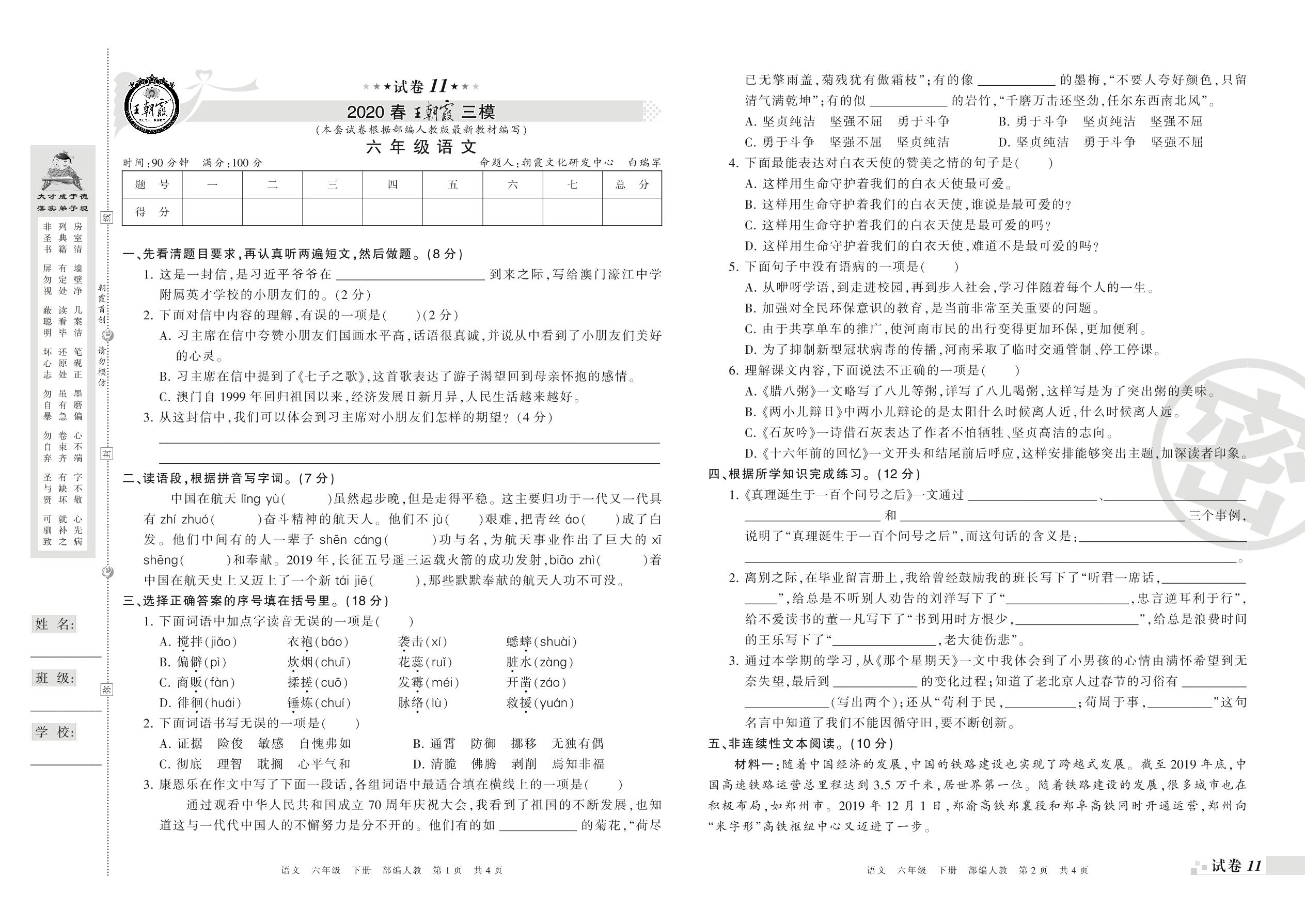 王朝霞期末模拟卷六年级下册语文(人教版)_R21080225407【11】