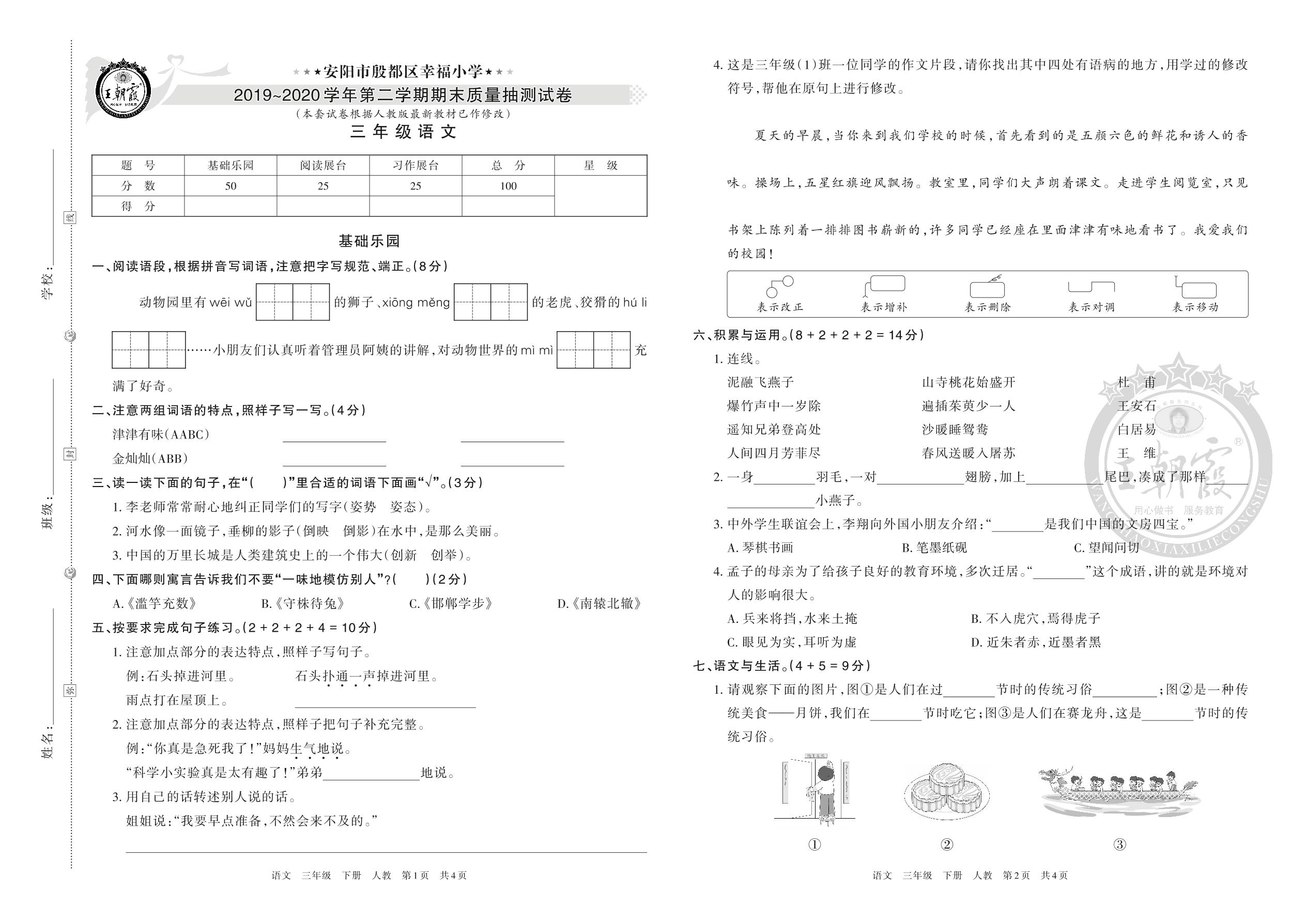 安阳市殷都区幸福小学2019-2020学年第二学期期末质量抽测试卷三年级语文(人教版)