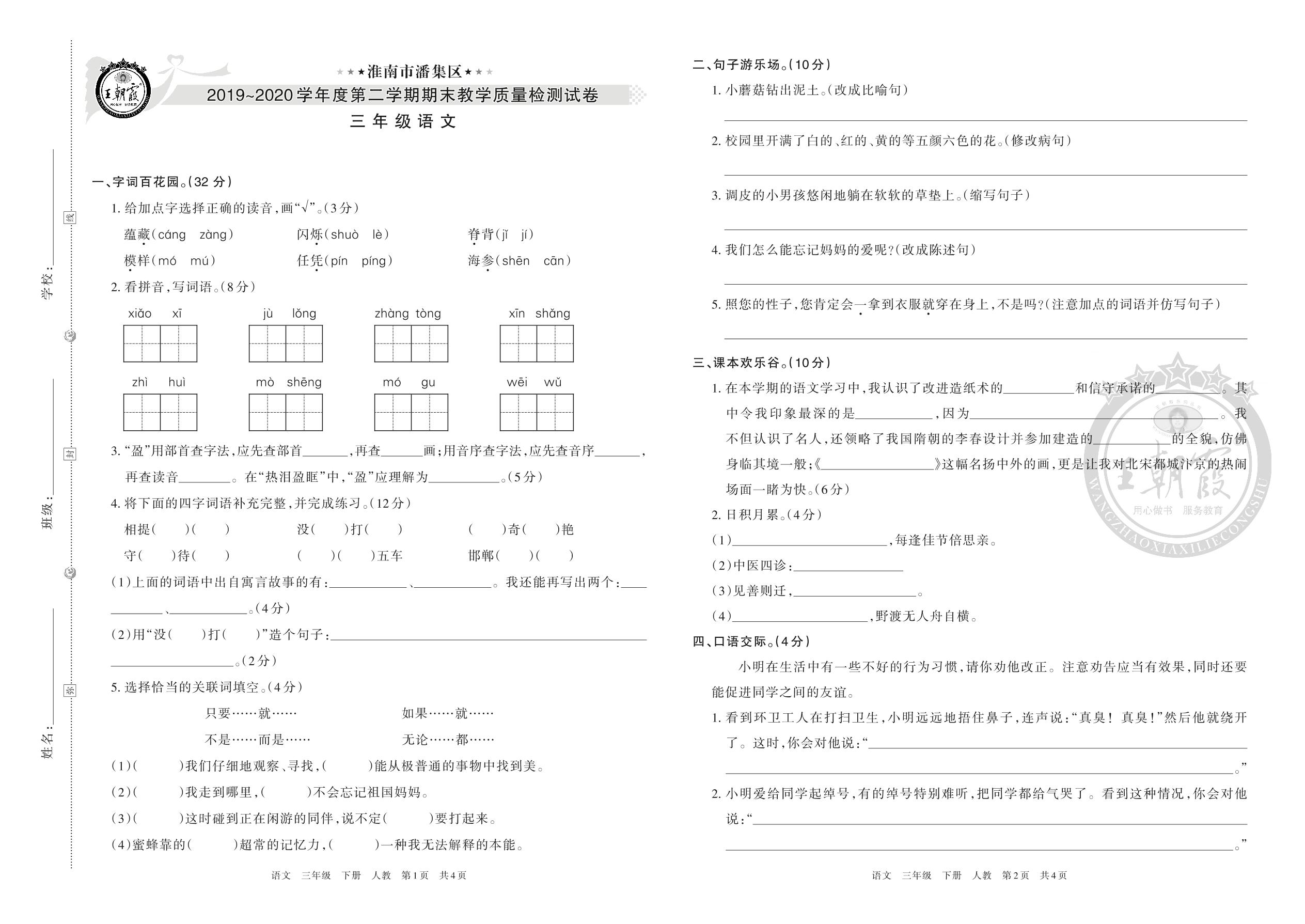 淮南市潘集区2019-2020学年度第二学期期末教学质量检测试卷三年级语文(人教版)