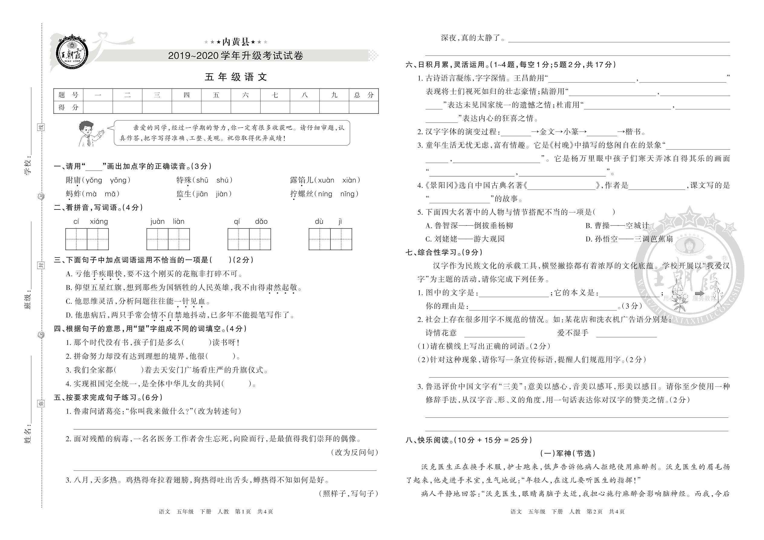 内黄县2019-~2020学年升级考试试卷五年级语文(人教版)