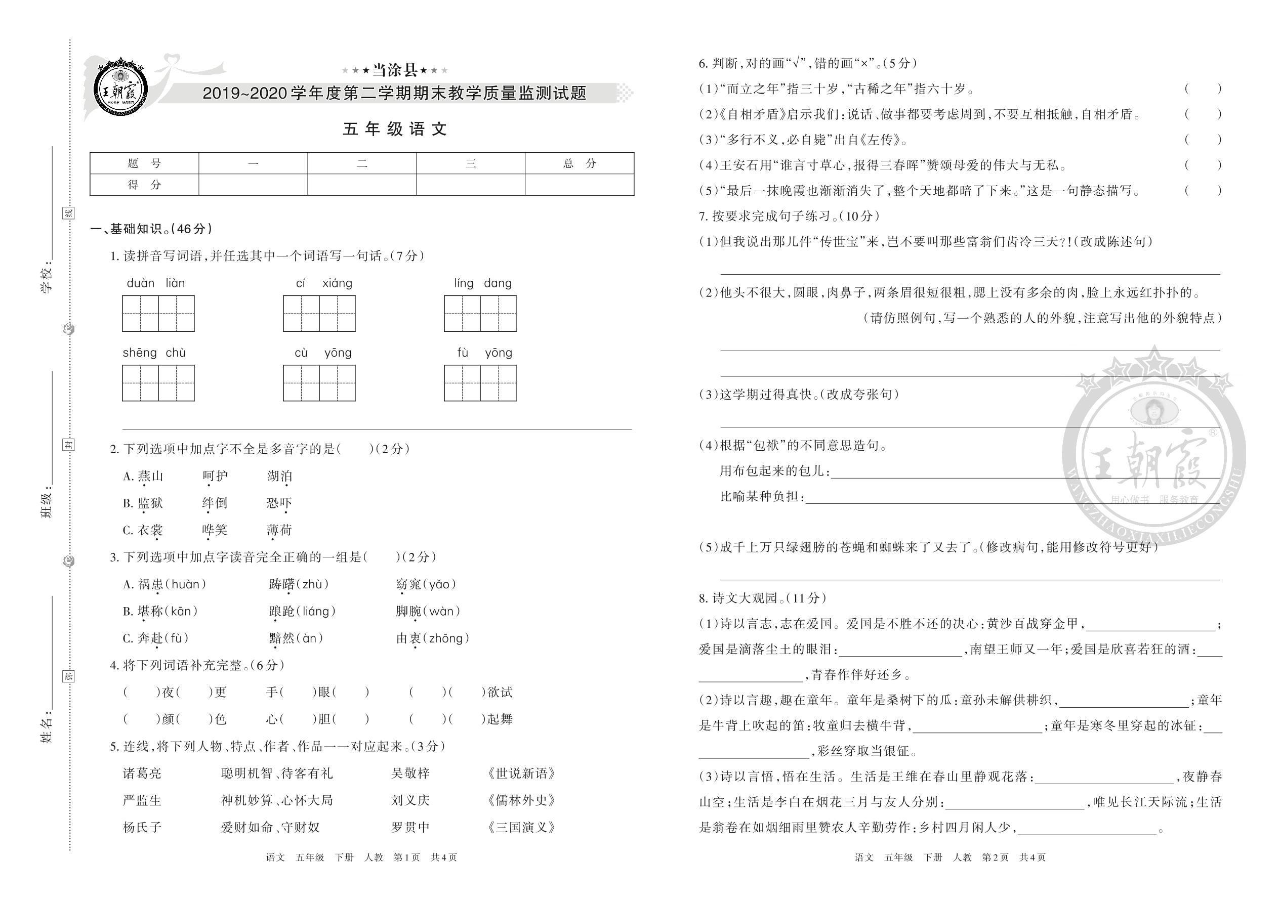 当涂县2019-2020学年度第二学期期末教学质量监测试题五年级语文(人教版)