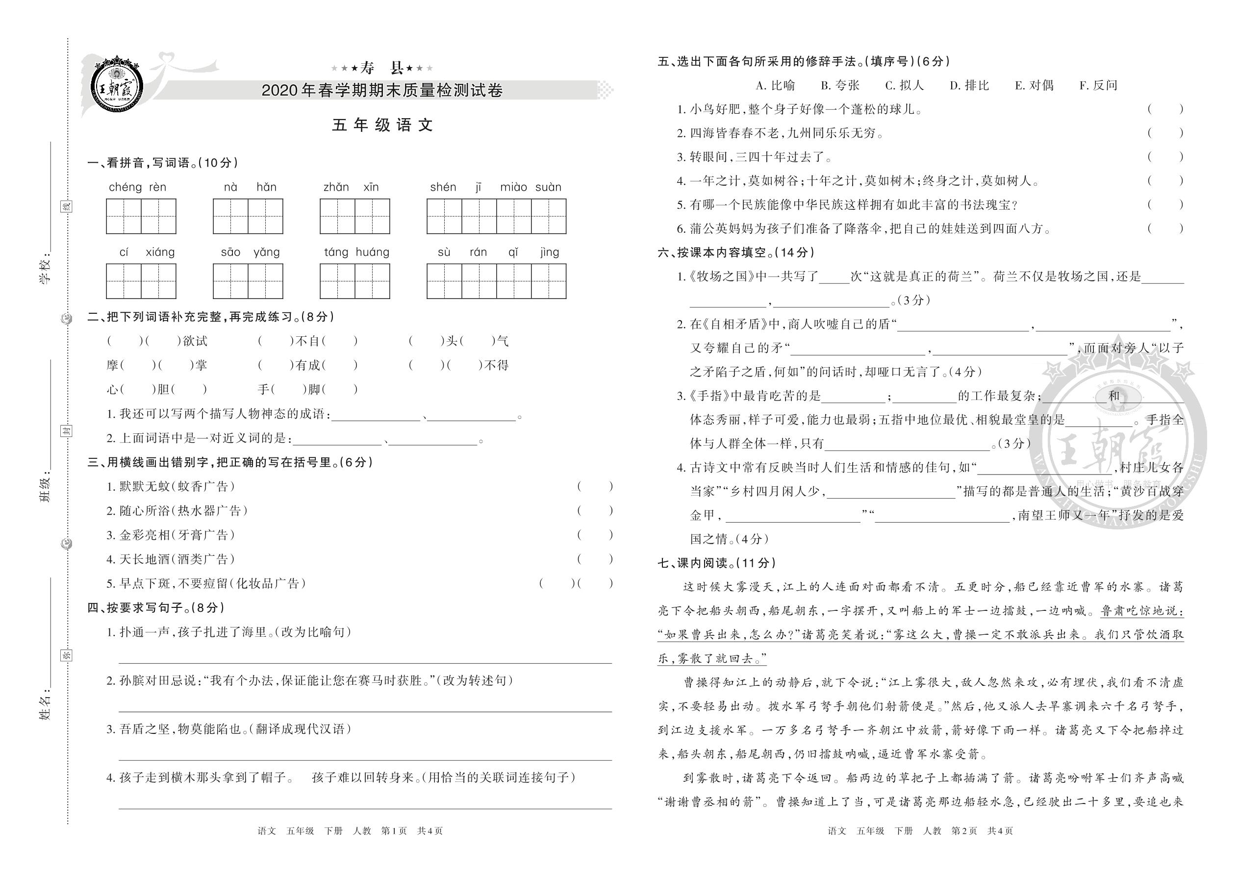 寿县2020年春学期期末质量检测试卷五年级语文(人教版)