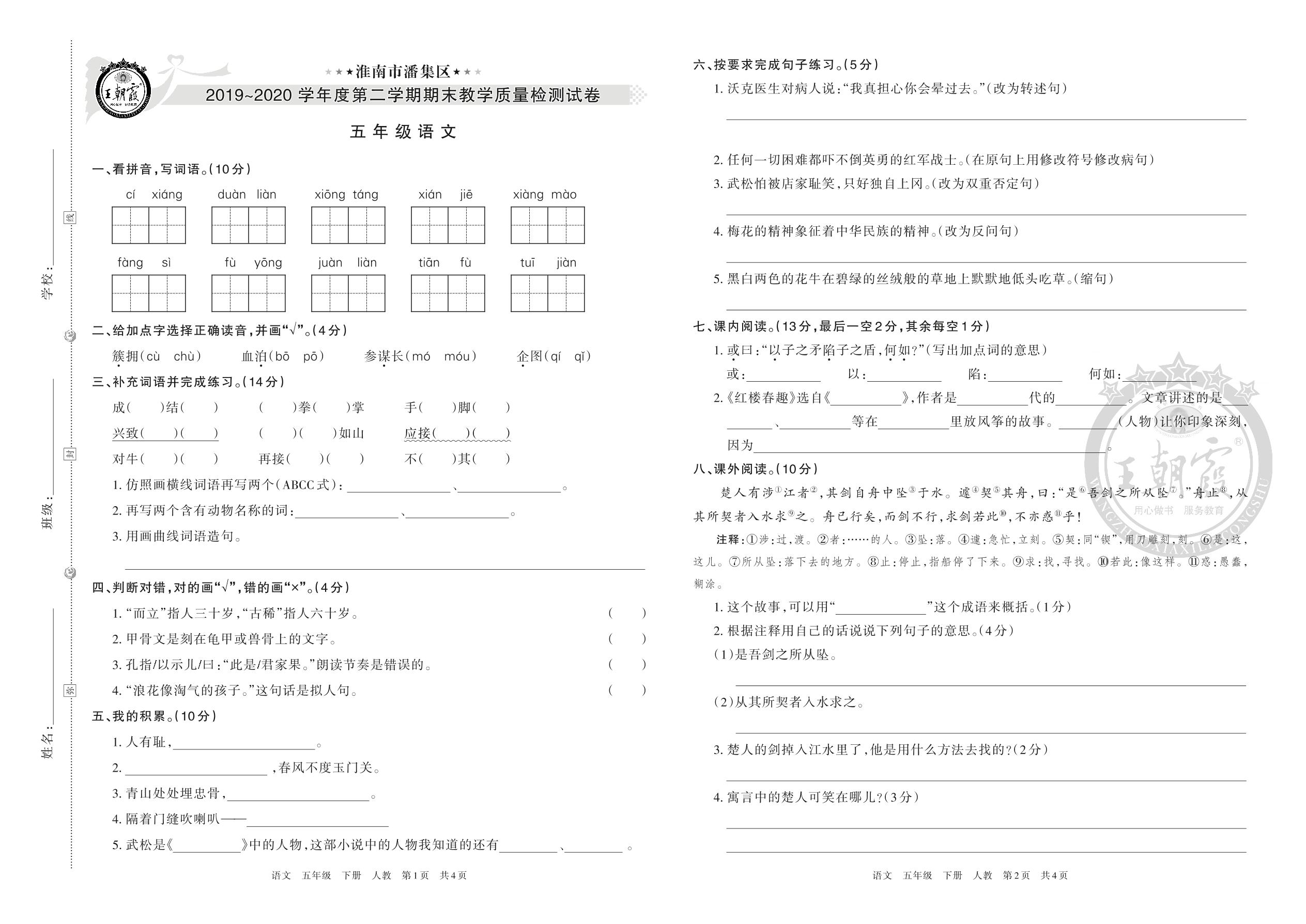 淮南市潘集区2019-2020学年度第二学期期末教学质量检测试卷五年级语文(人教版)