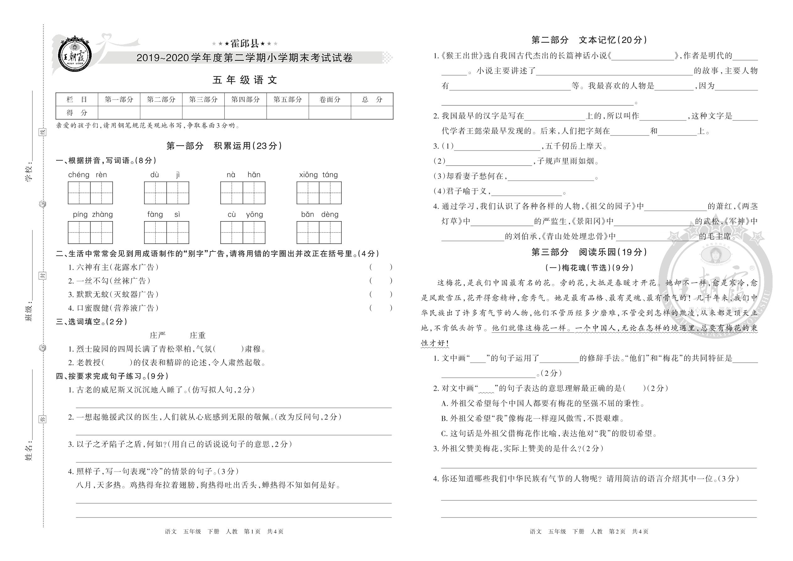 霍邱县2019-2020学年度第二学期小学期末考试试卷五年级语文(人教版)
