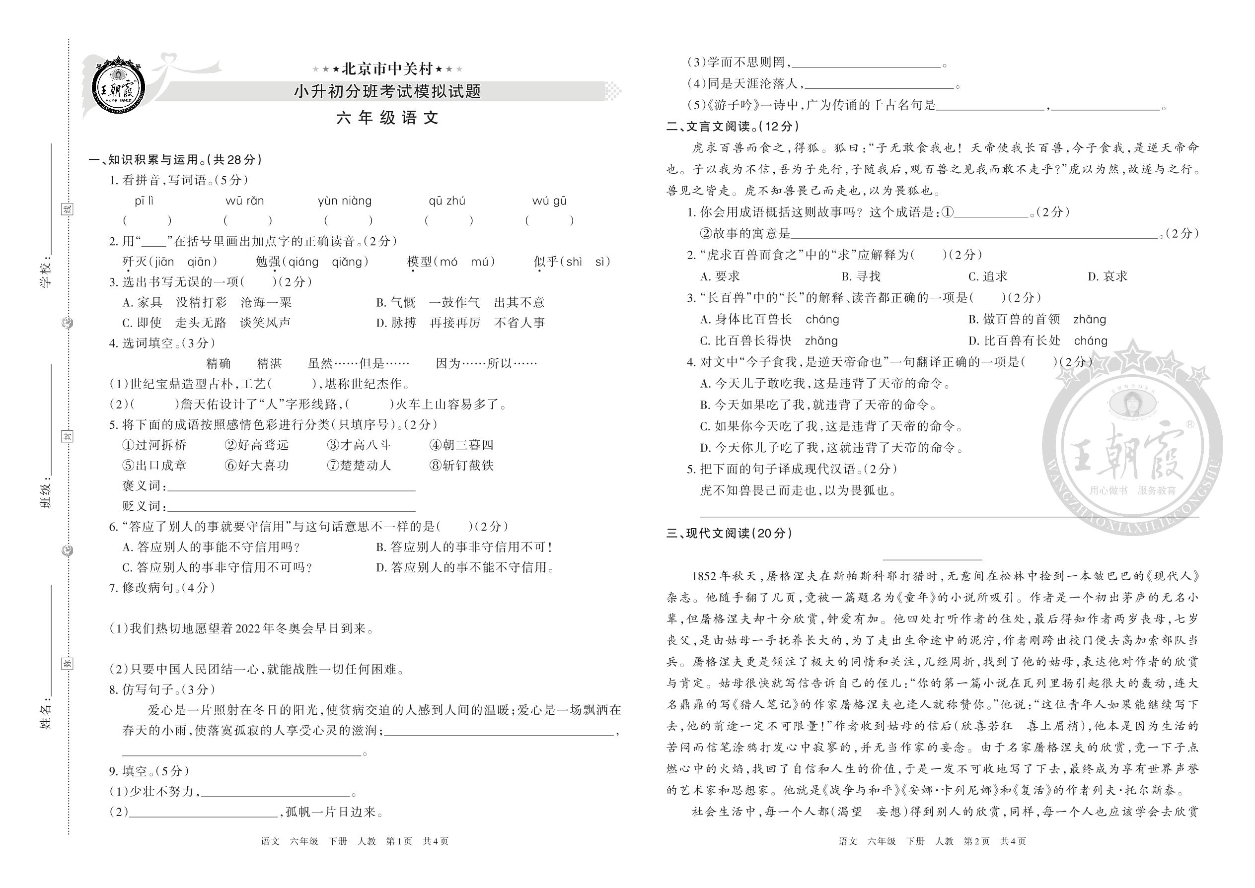 北京市中关村小升初分班考试摸拟试题六年级语文