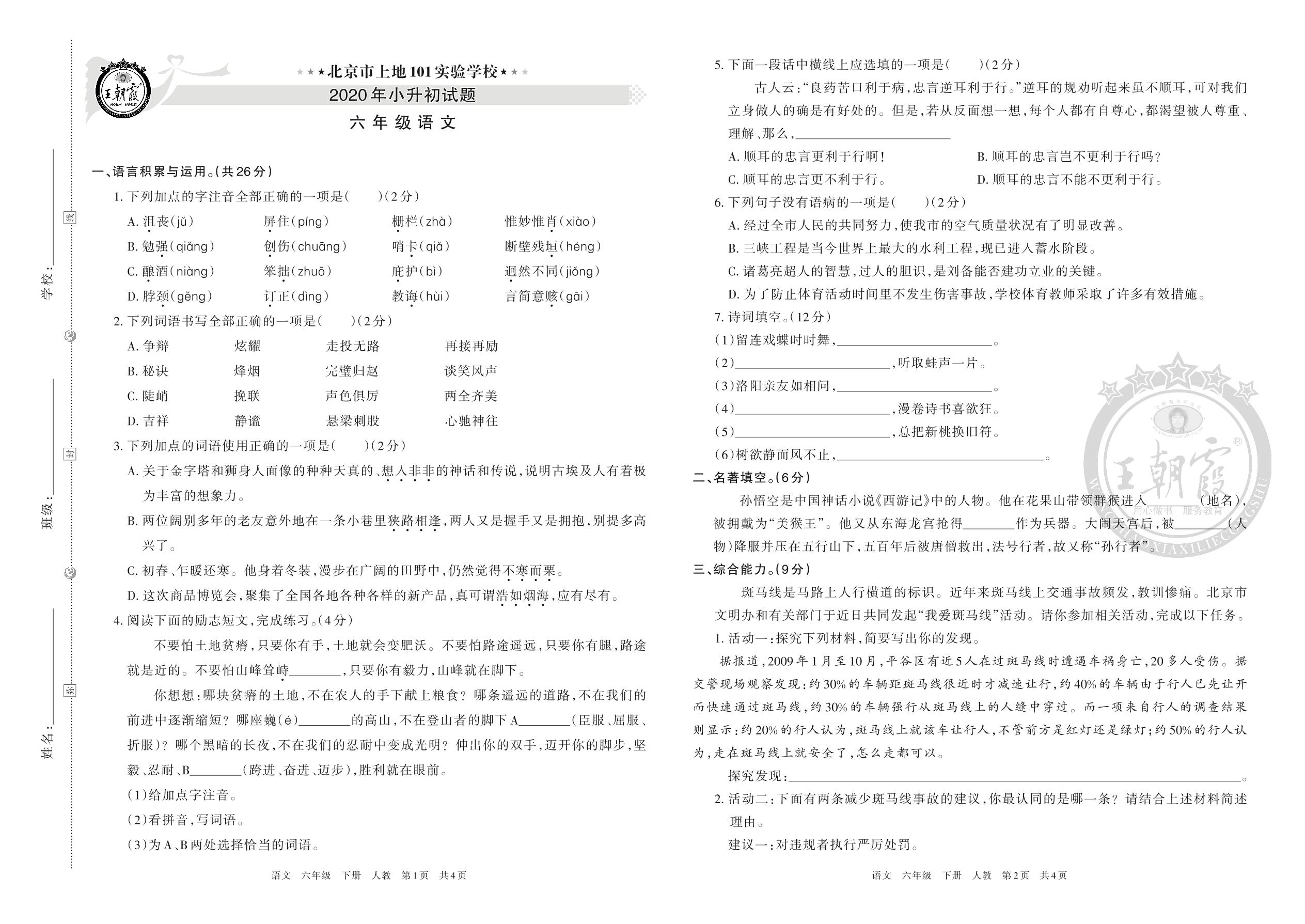 北京市上地101实验学校2020年小升初试题六年级语文