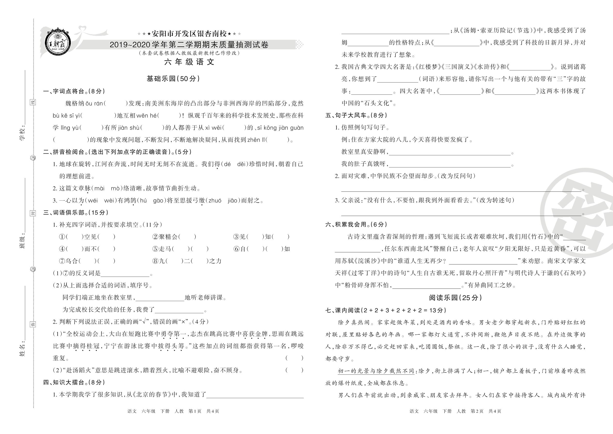 安阳市开发区银杏南校2019-2020学年第二学期期末质量抽测试卷六年级语文(人教版)