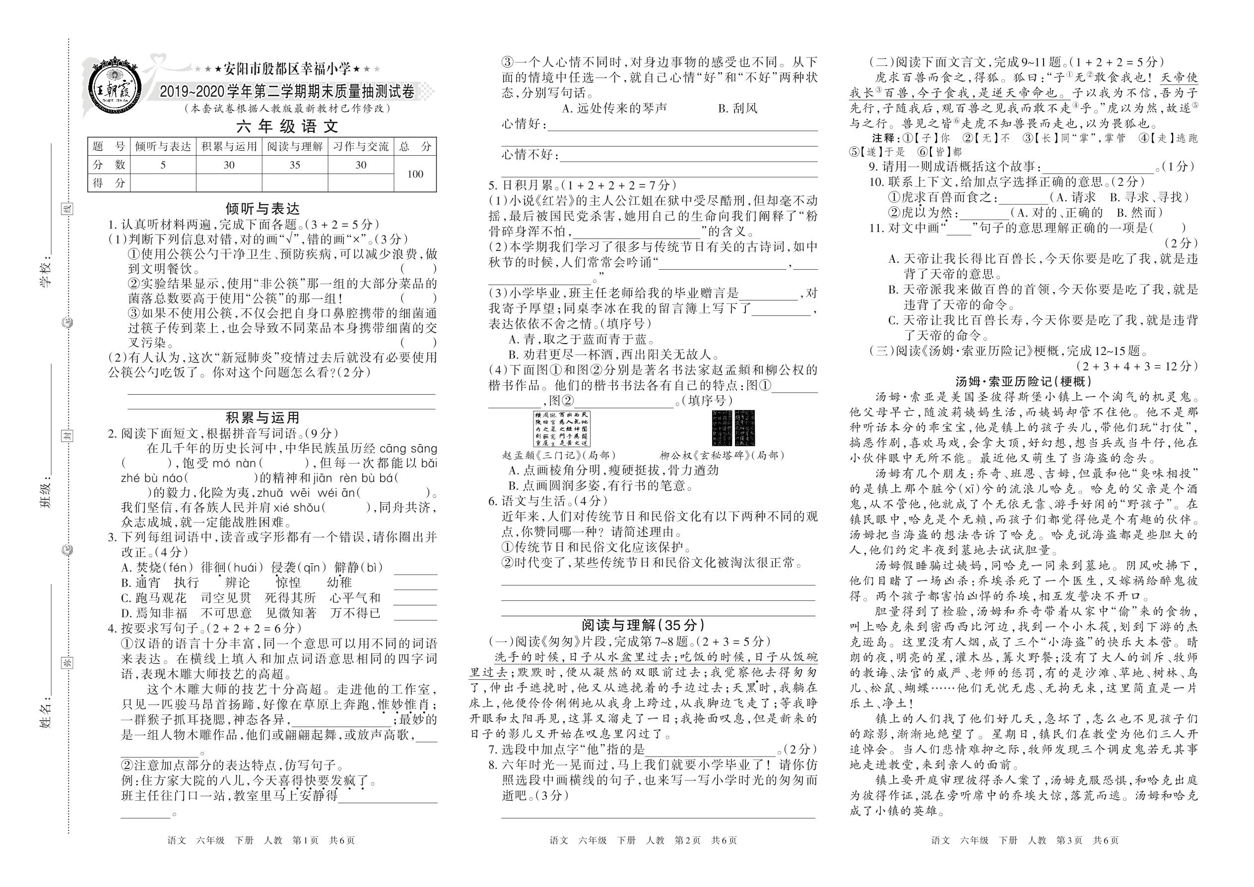 安阳市殷都区幸福小学2019-2020学年第二学期期末质量抽测试卷六年级语文(人教版)