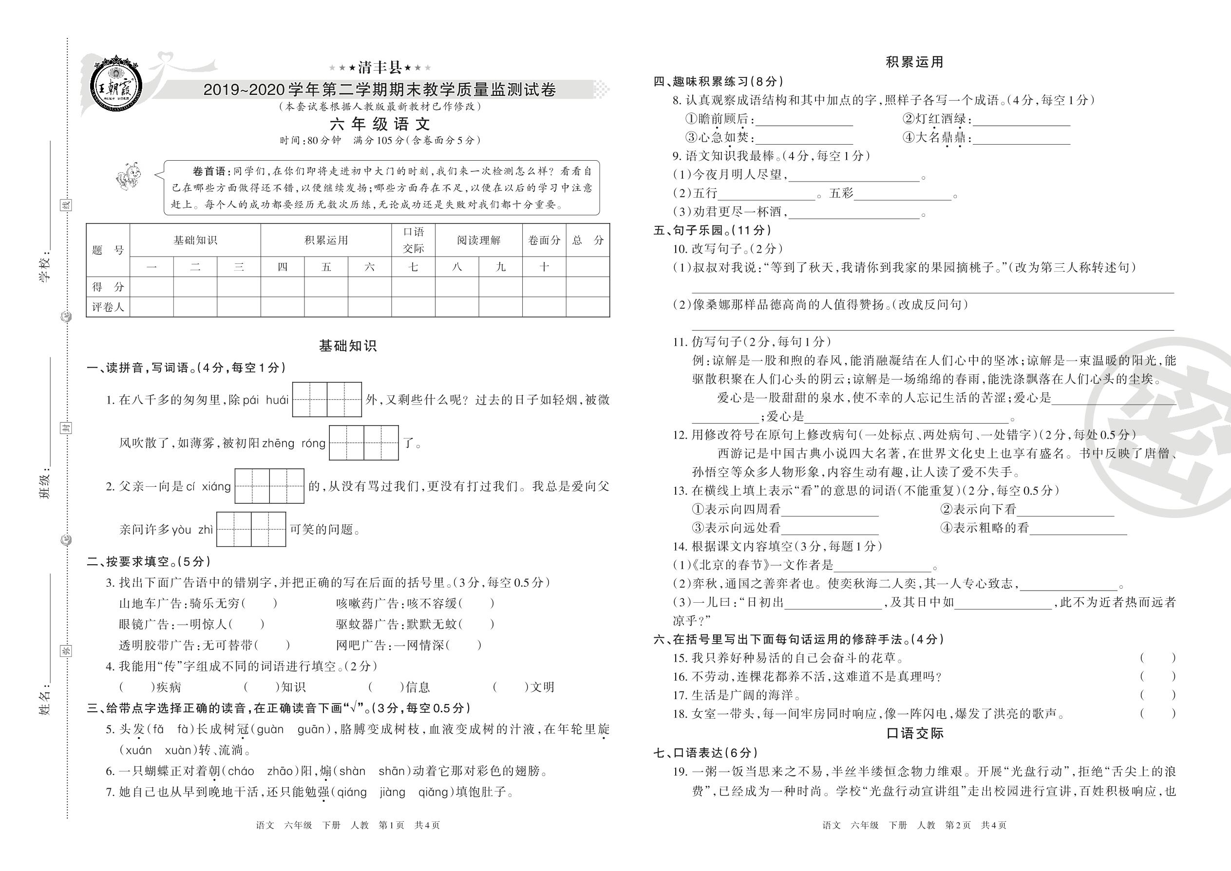 清丰县2019-2020学年第二学期期末教学质量监测试卷六年级语文(人教版)