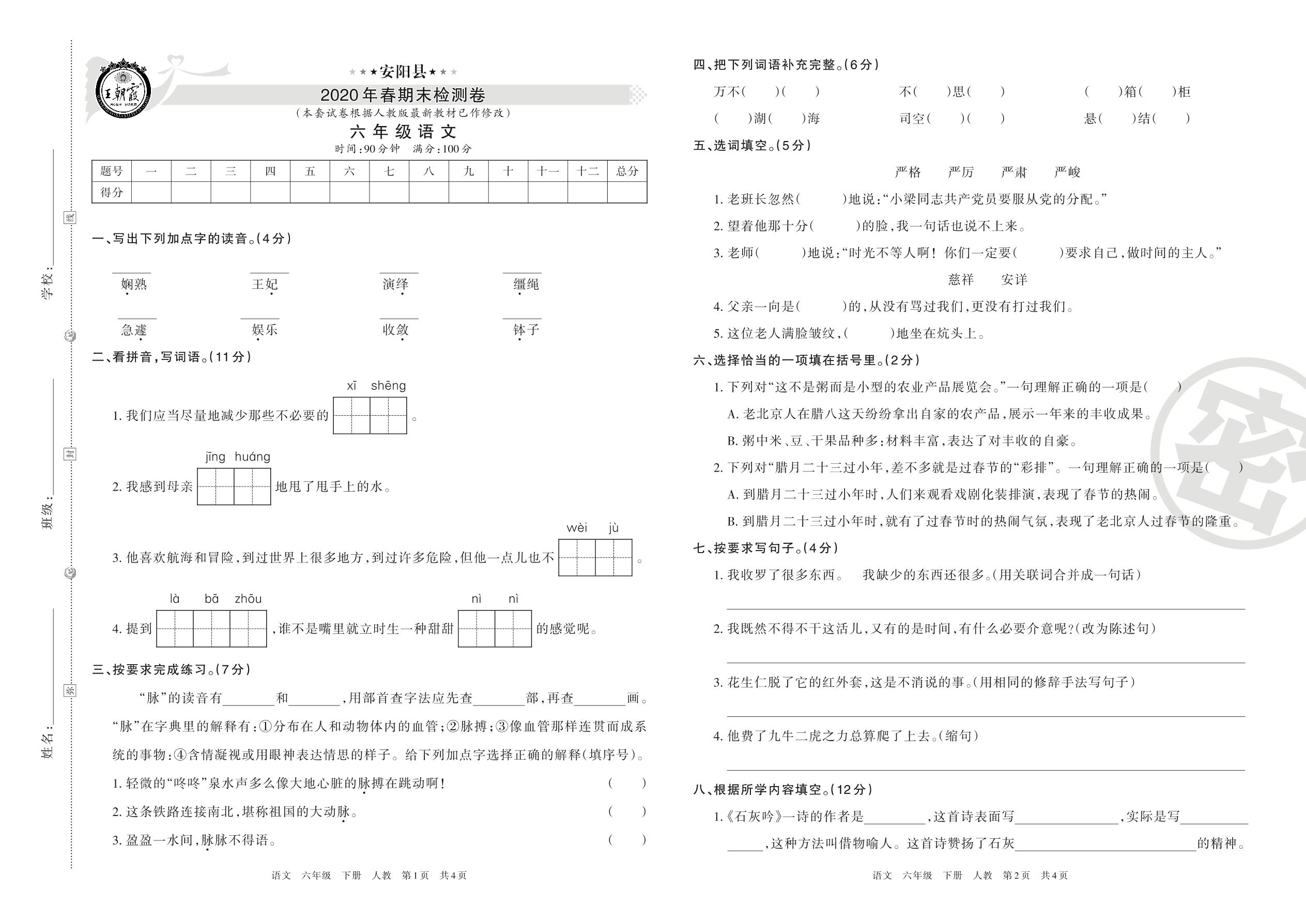 安阳县2020年春期末检测卷六年级语文(人教版)