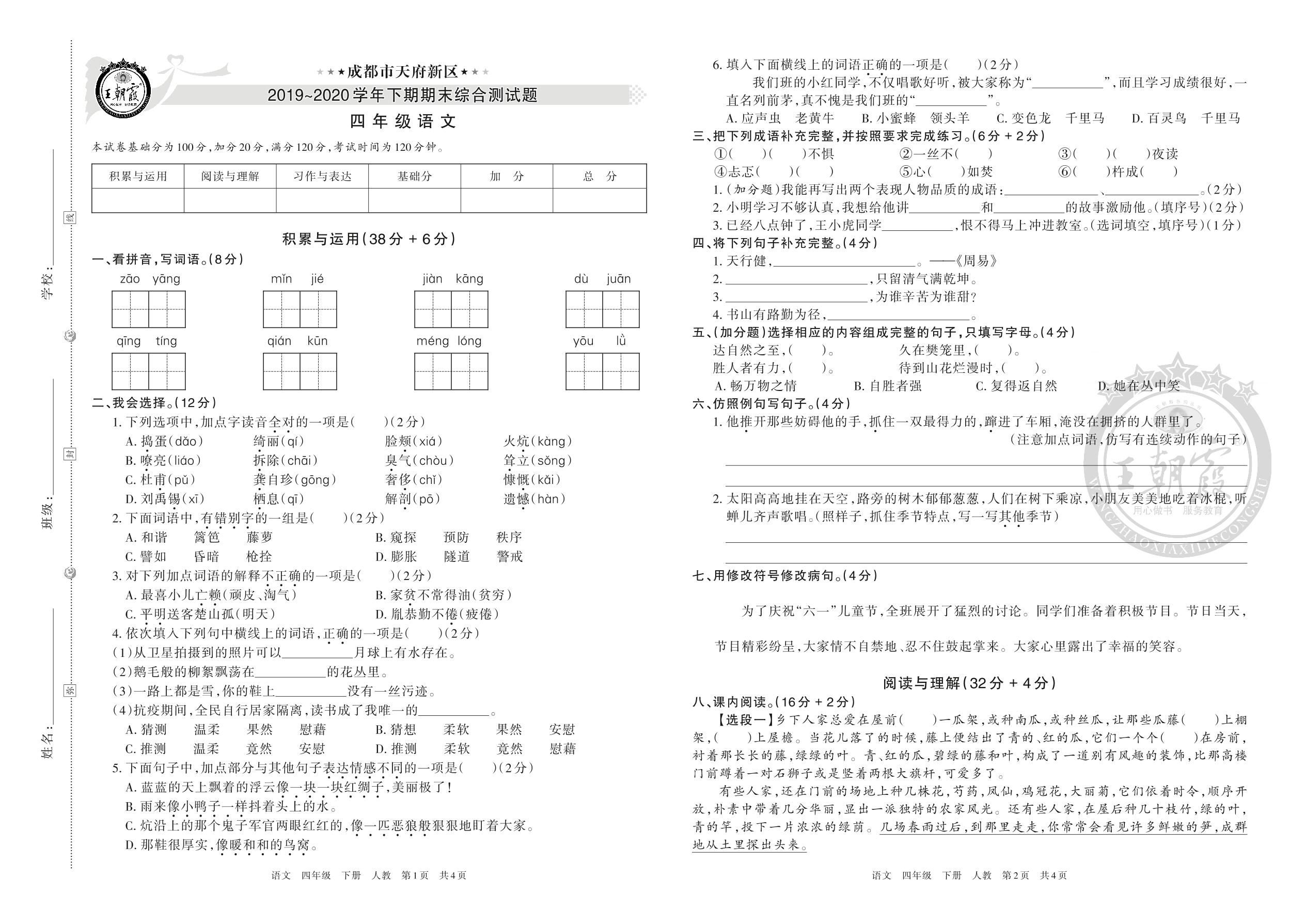 成都市天府新区2019-2020学年下期期末综合测试题四年级语文
