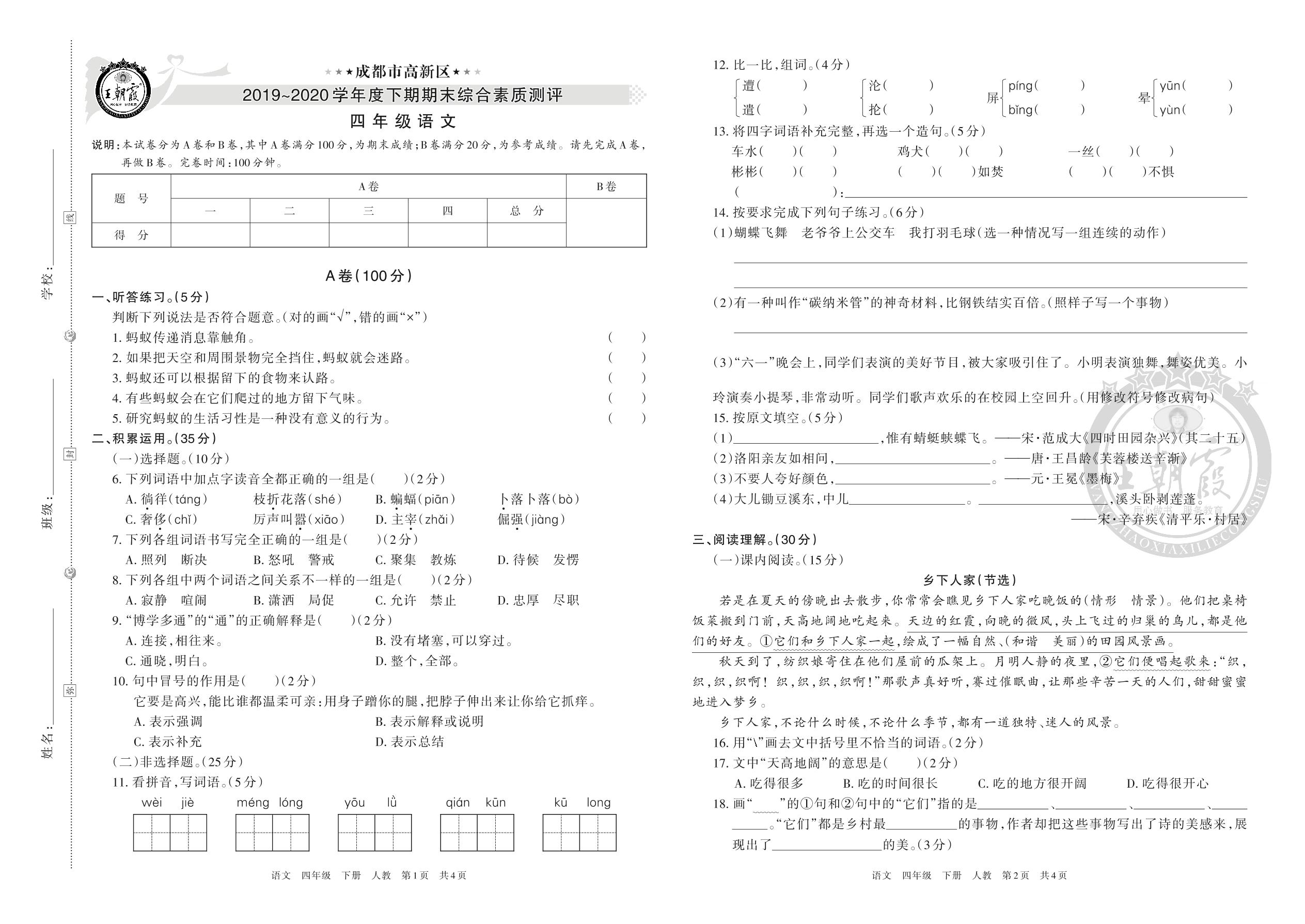 成都市高新区2019-2020学年度下期期末综合素质测评四年级语文