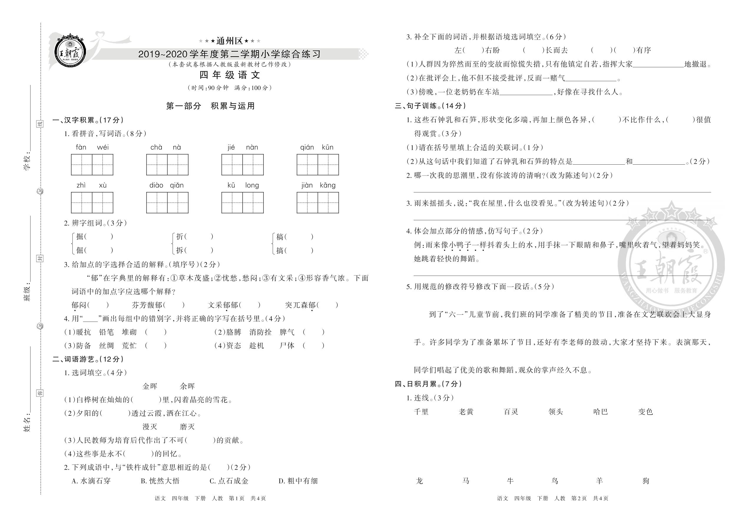 通州区2019-2020学年度第二学期小学综合练习四年级语文(人教版)