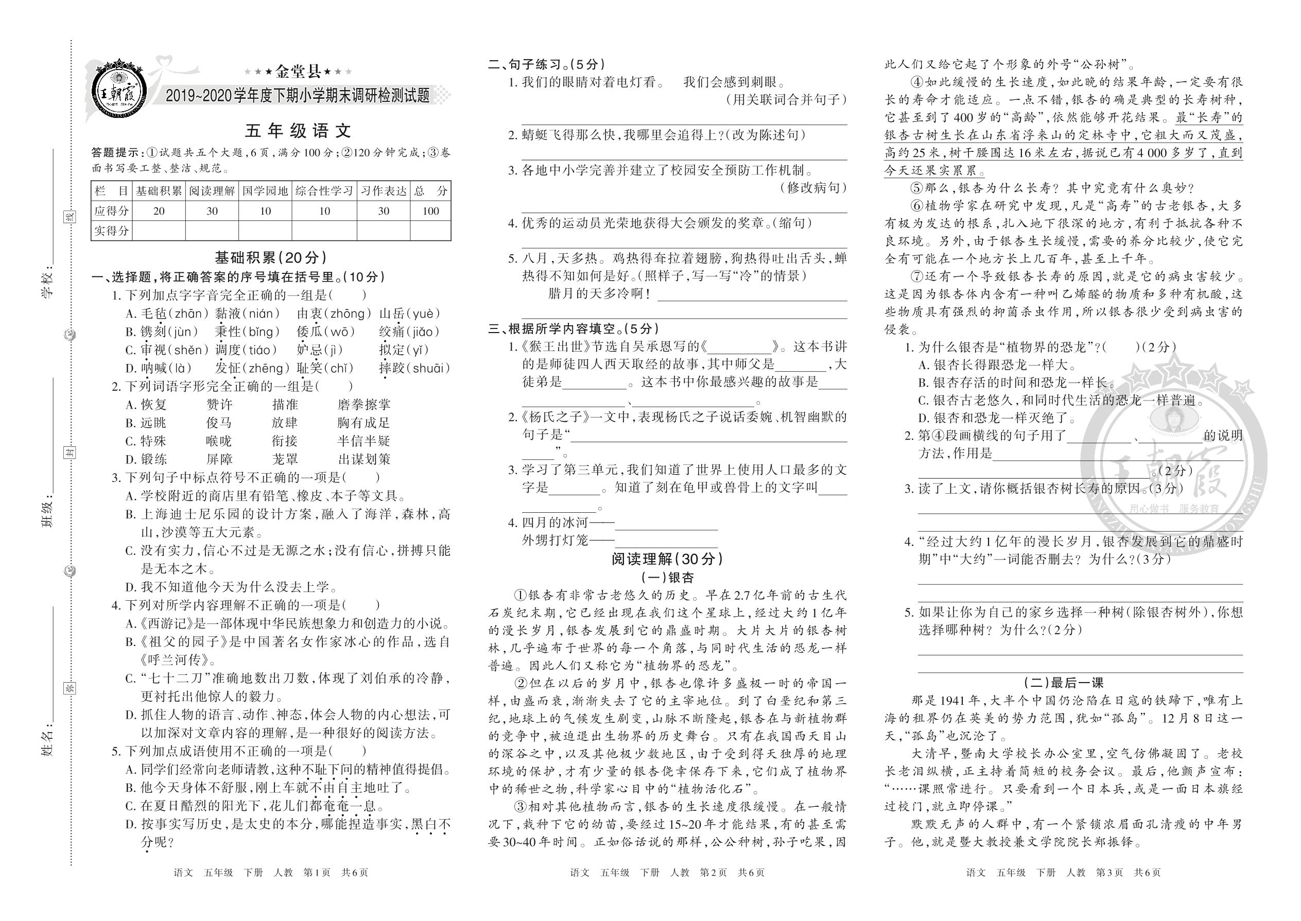 金堂县2019~2020学年度下期小学期末调研检测试题五年级语文