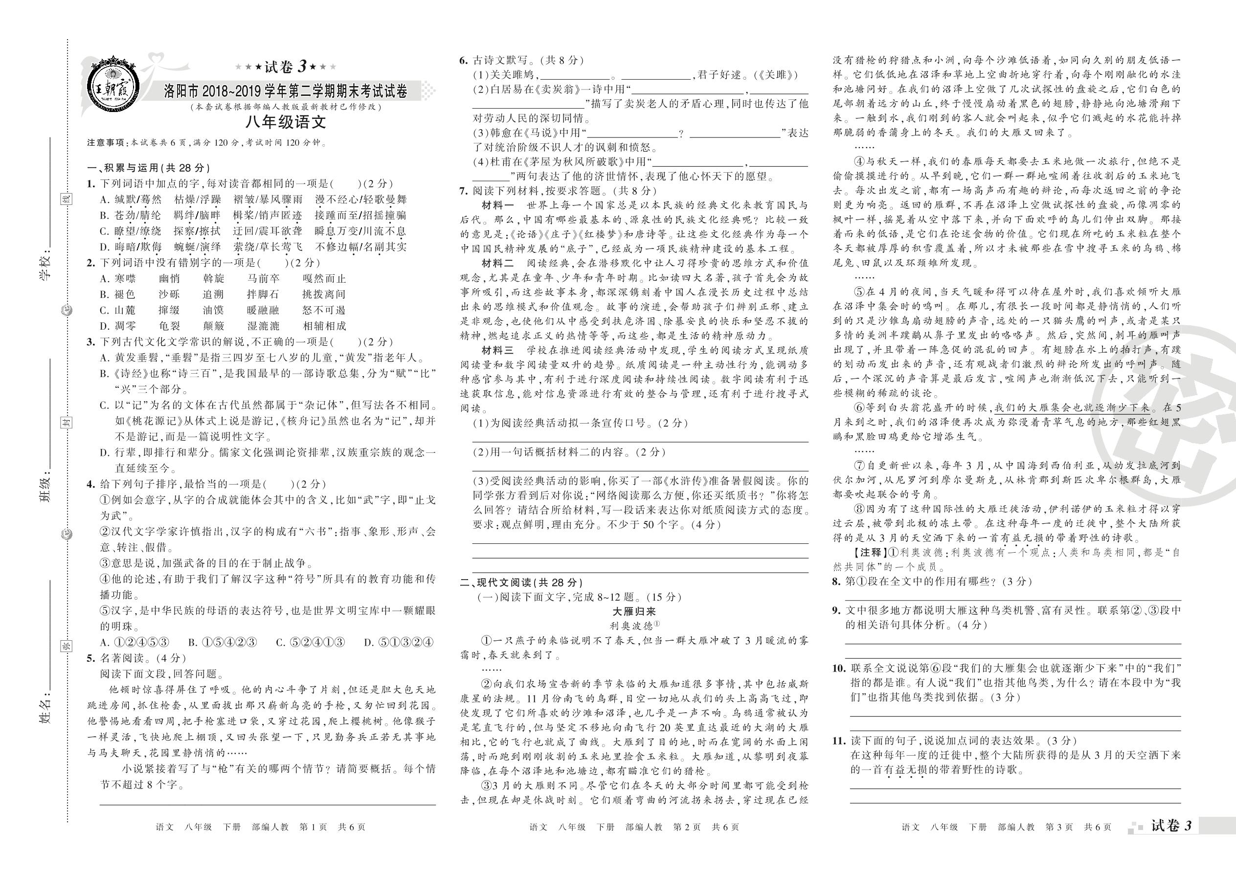 2018-2019学年第二学期洛阳市八年级语文试卷(人教版)【3】