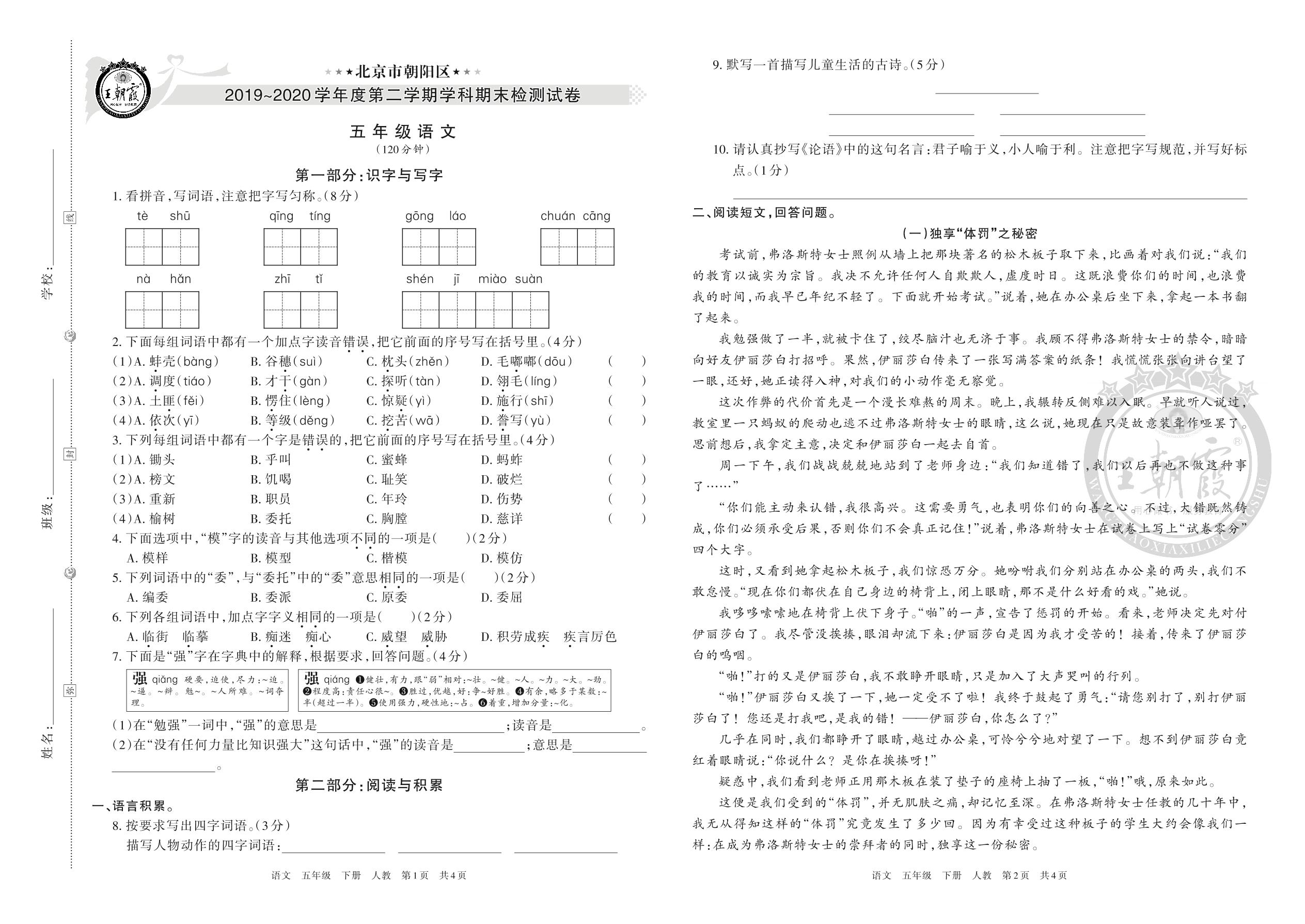 北京市朝阳区2019~2020学年度第二学期学科期末监测试卷五年级语文人教版(人教版)