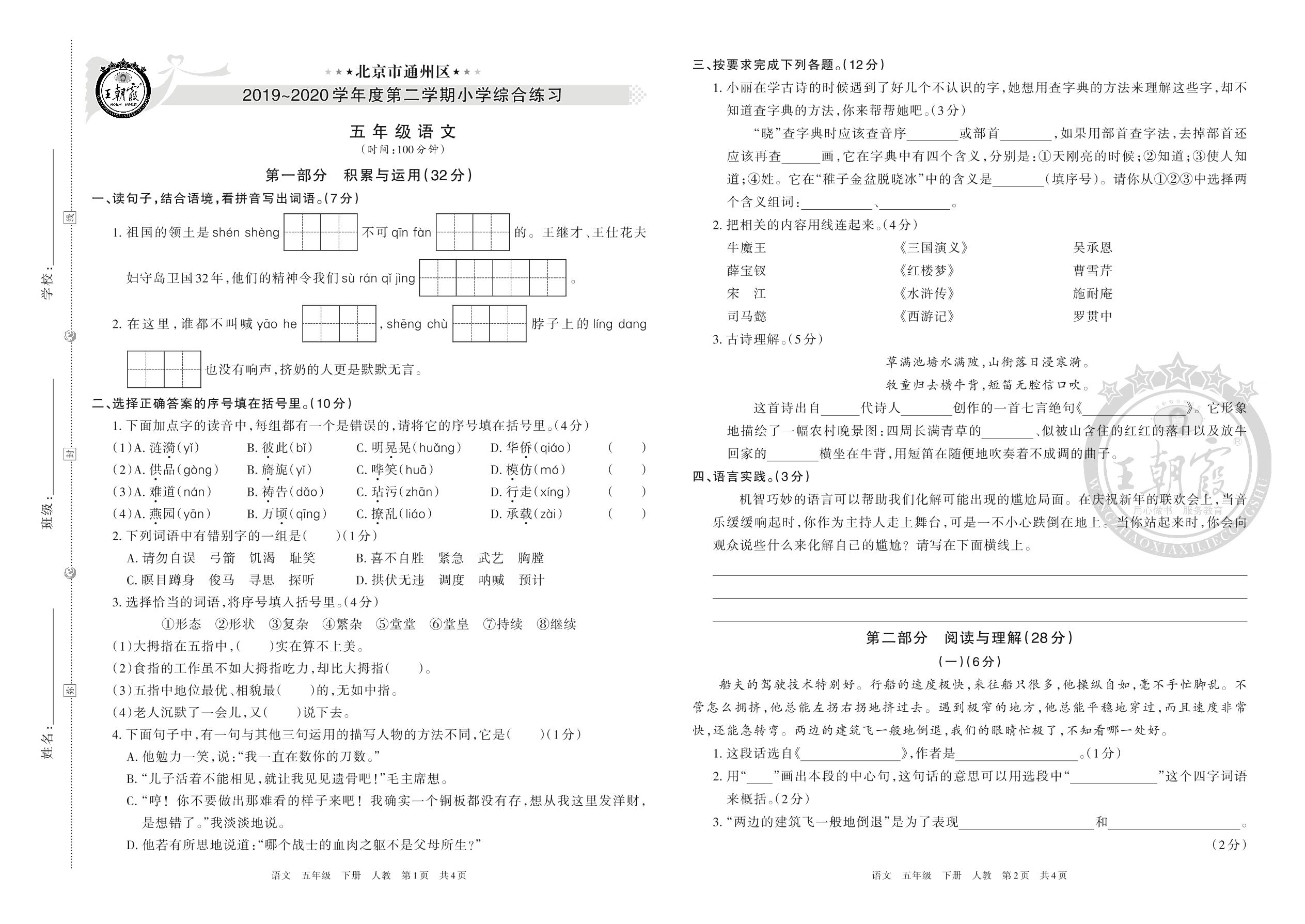 北京市通州区小学2019~2020学年度第二学期综合练习五年级语文人教版(人教版)
