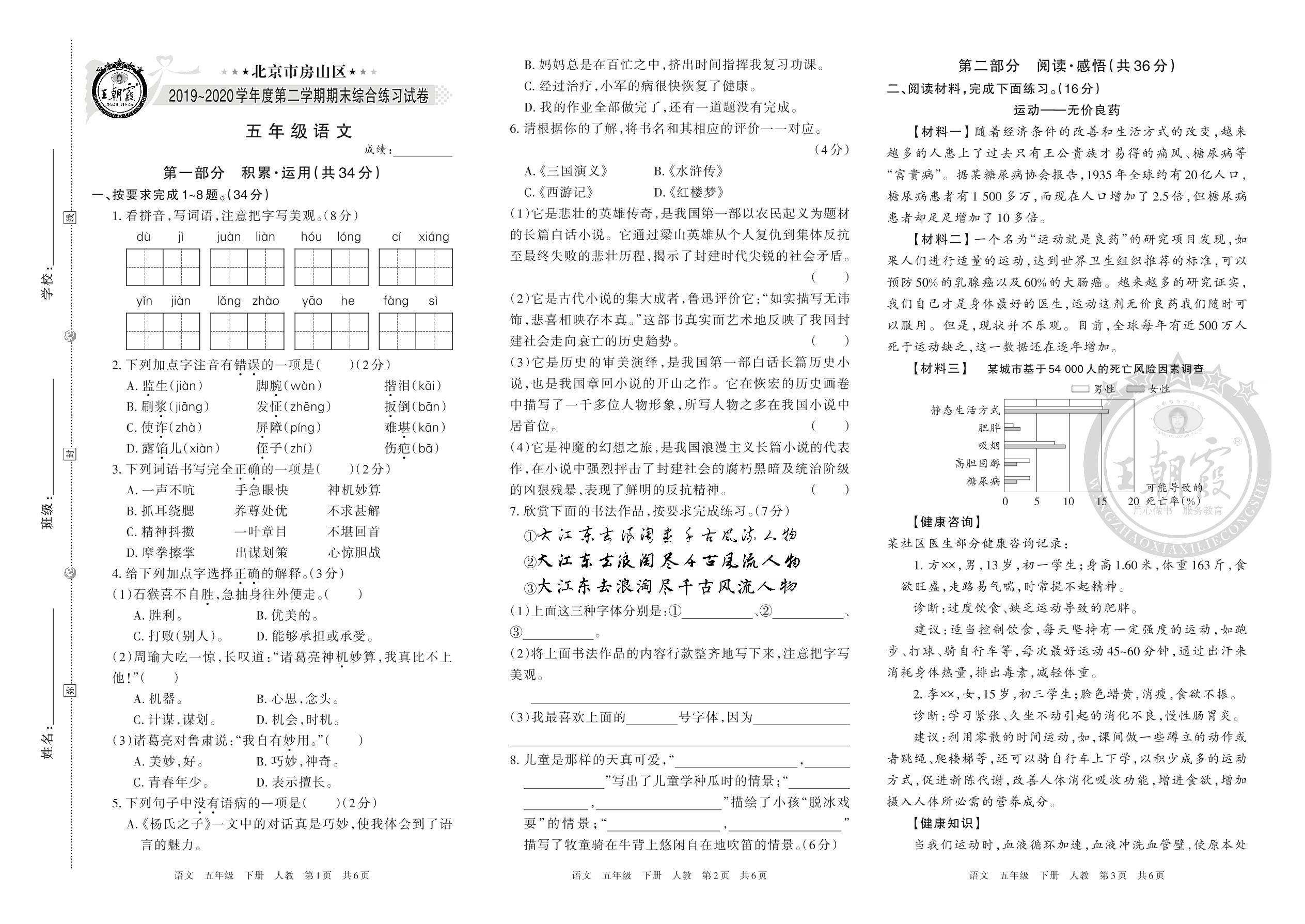 北京市房山区2019~2020学年度第二学期期末综合练习试卷五年级语文人教版(人教版)
