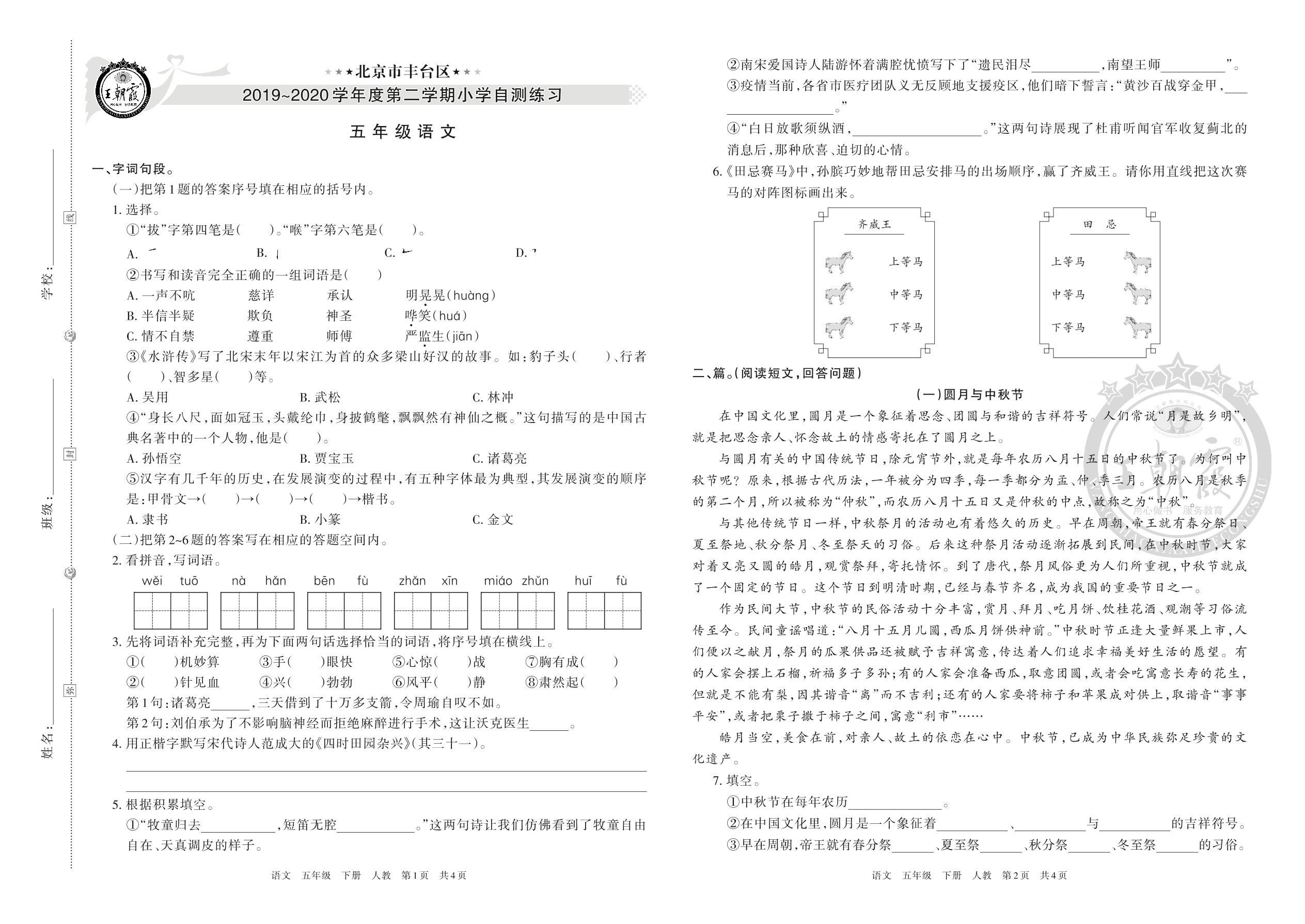 北京市丰台区2019~2020学年度第二学期小学自测练习五年级语文人教版(人教版)