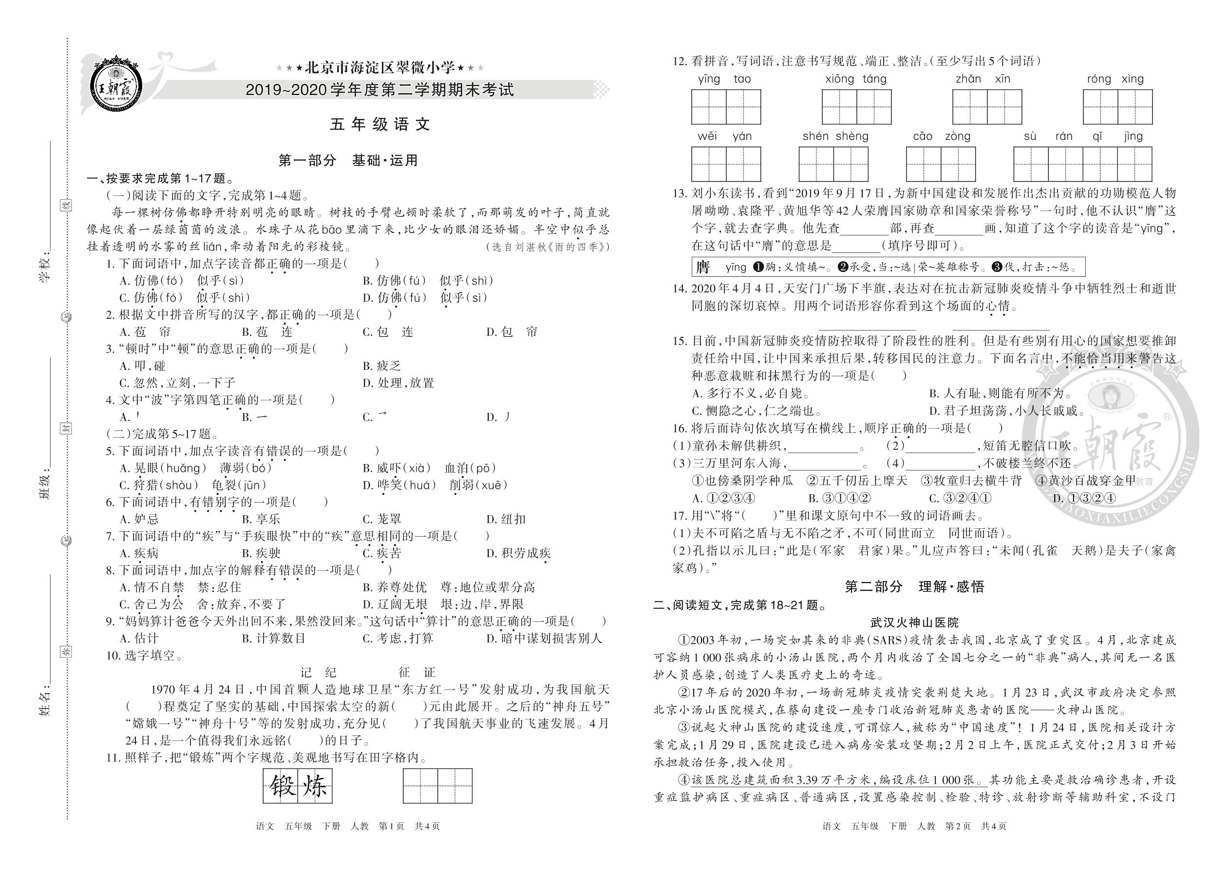 北京市海淀区2019~2020学年度第二学期期末考试五年级语文人教版(人教版)