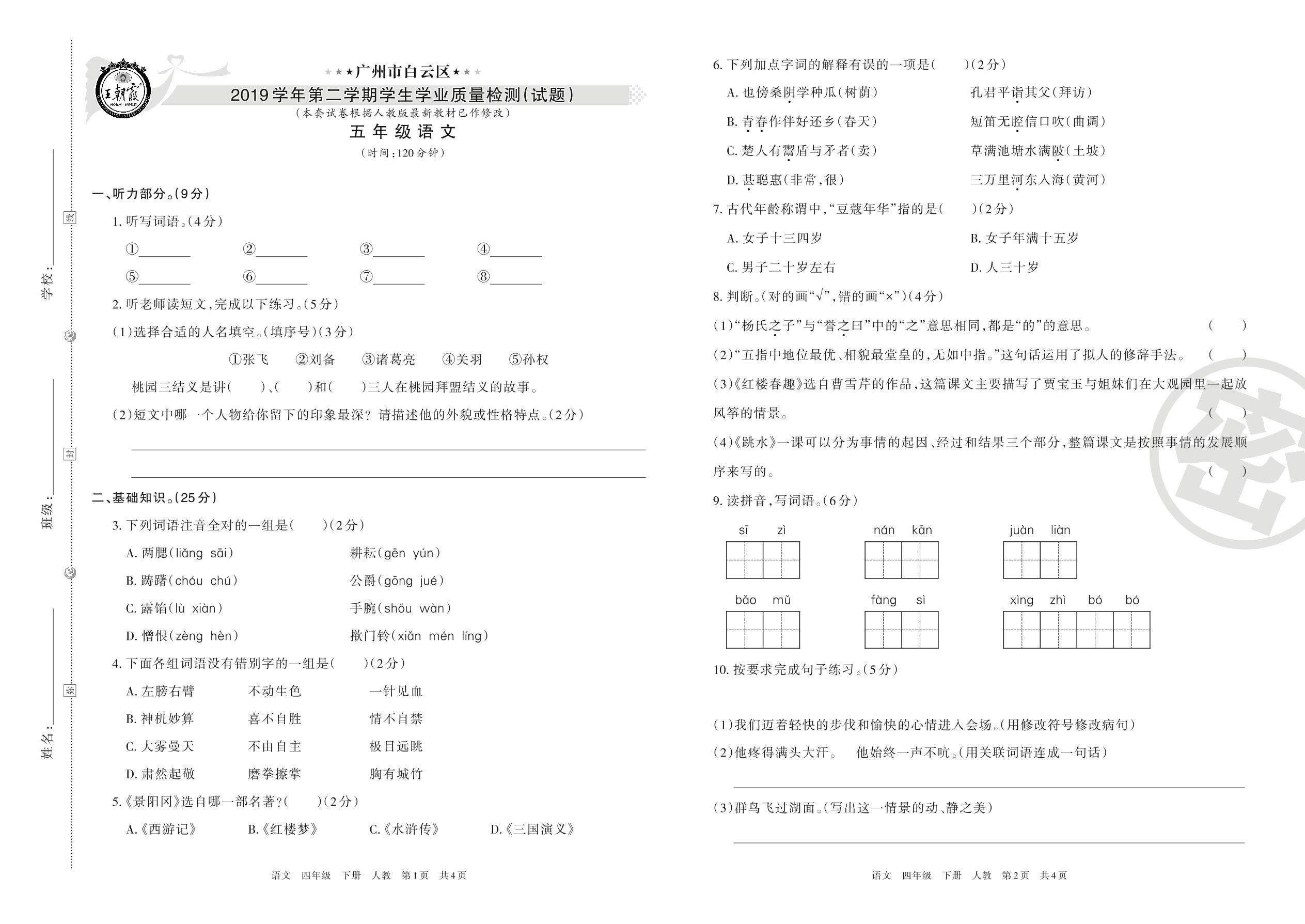广州市白云区2019学年第二学期学生学业质量检测(试题)五年级语文