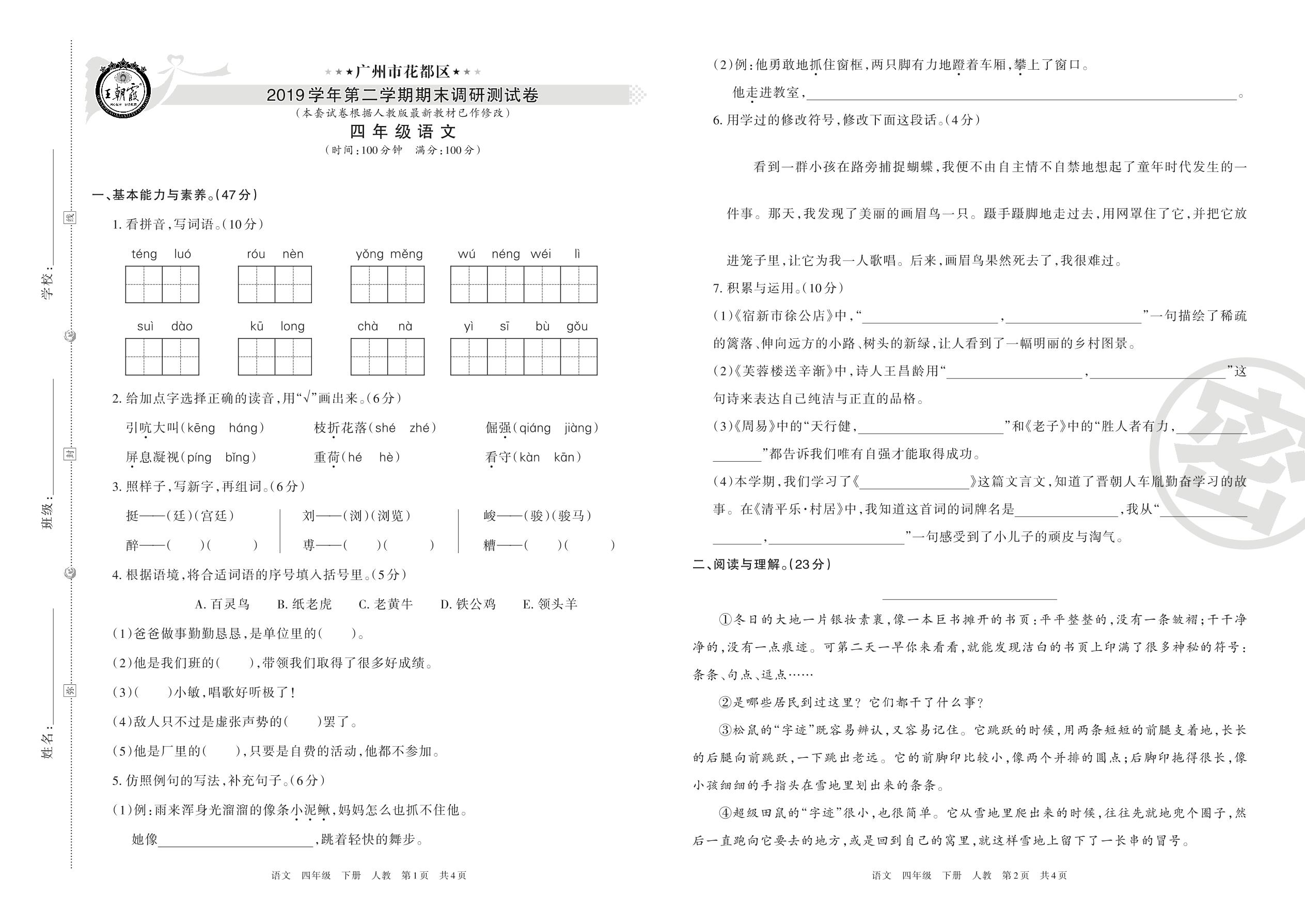 广州市花都区2019学年第二学期期末调研测试卷四年级语文
