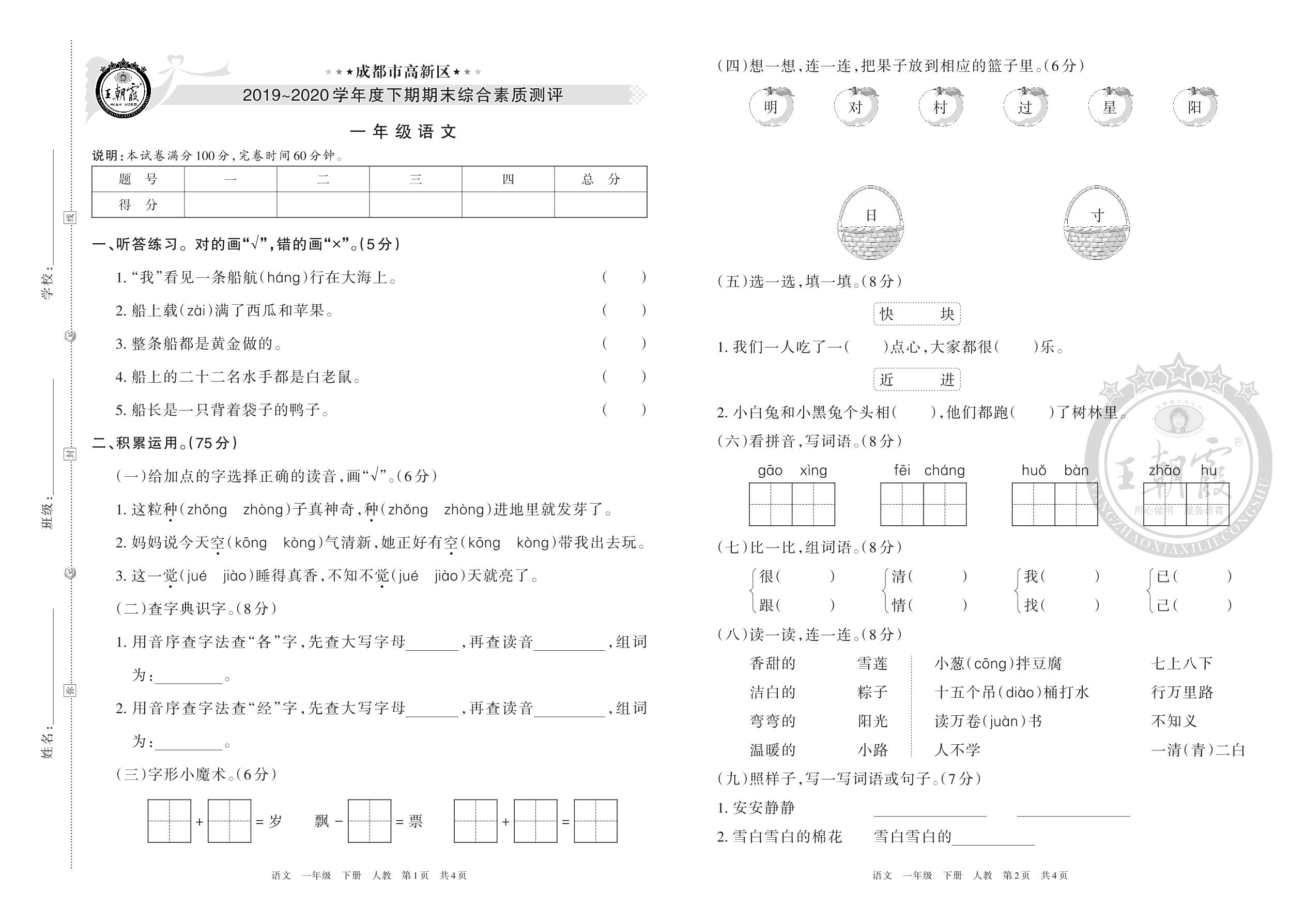 成都市高新区2019-2020学年度下期期末综合素质测评一年级语文