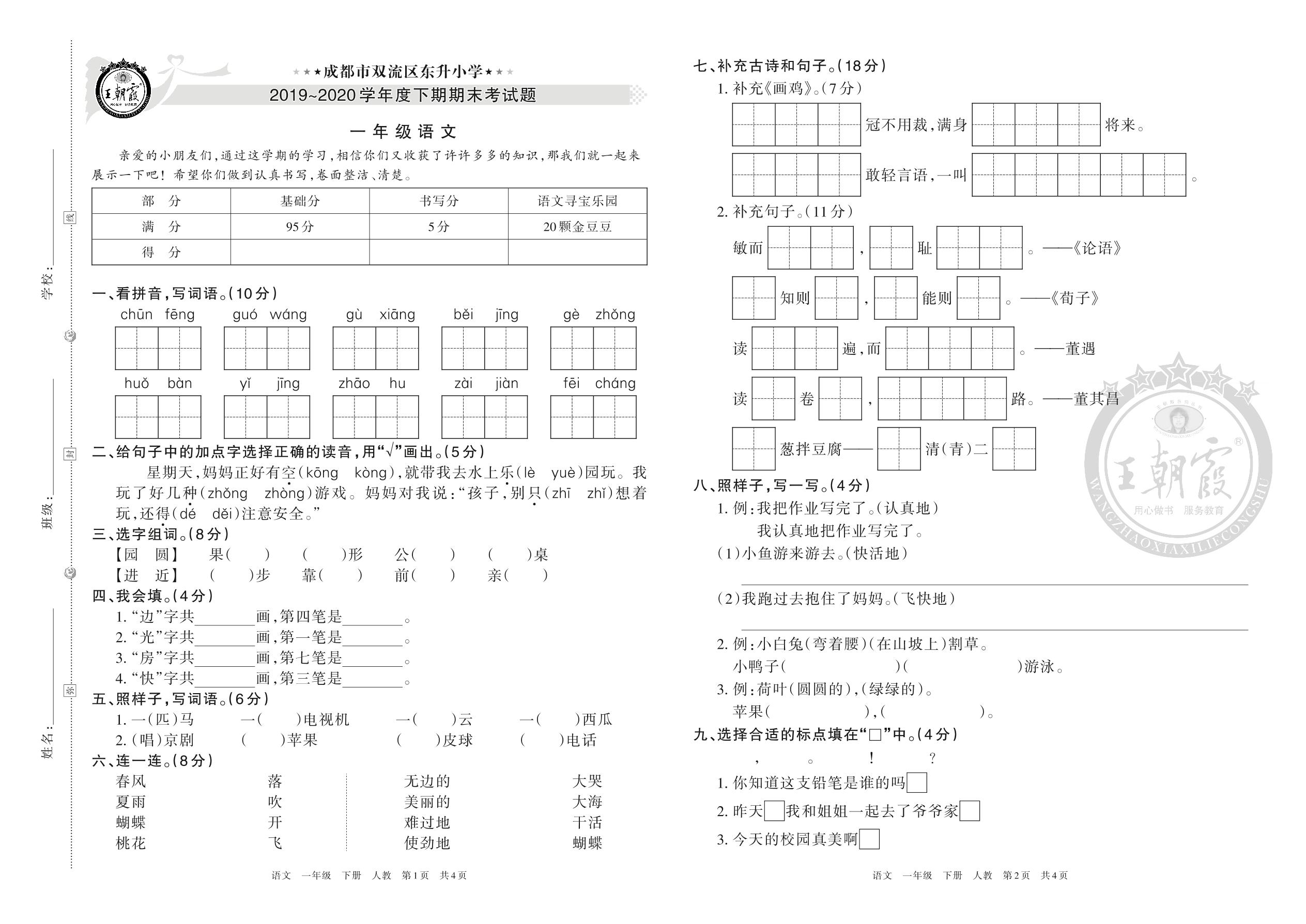 成都市双流区东升小学2019-2020学年度下期期末考试题一年级语文