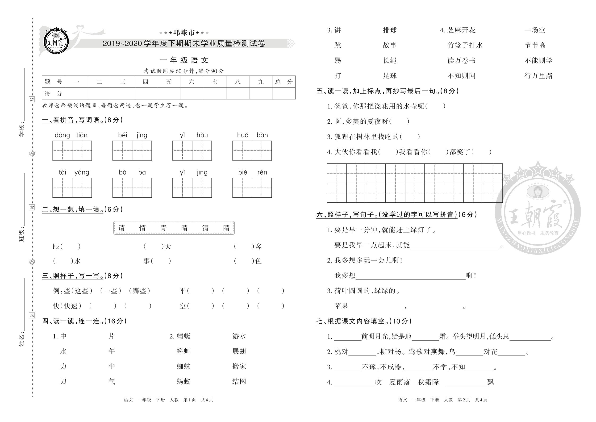 邛崃市2019-2020学年度下期期末学业质量检测试卷一年级语文