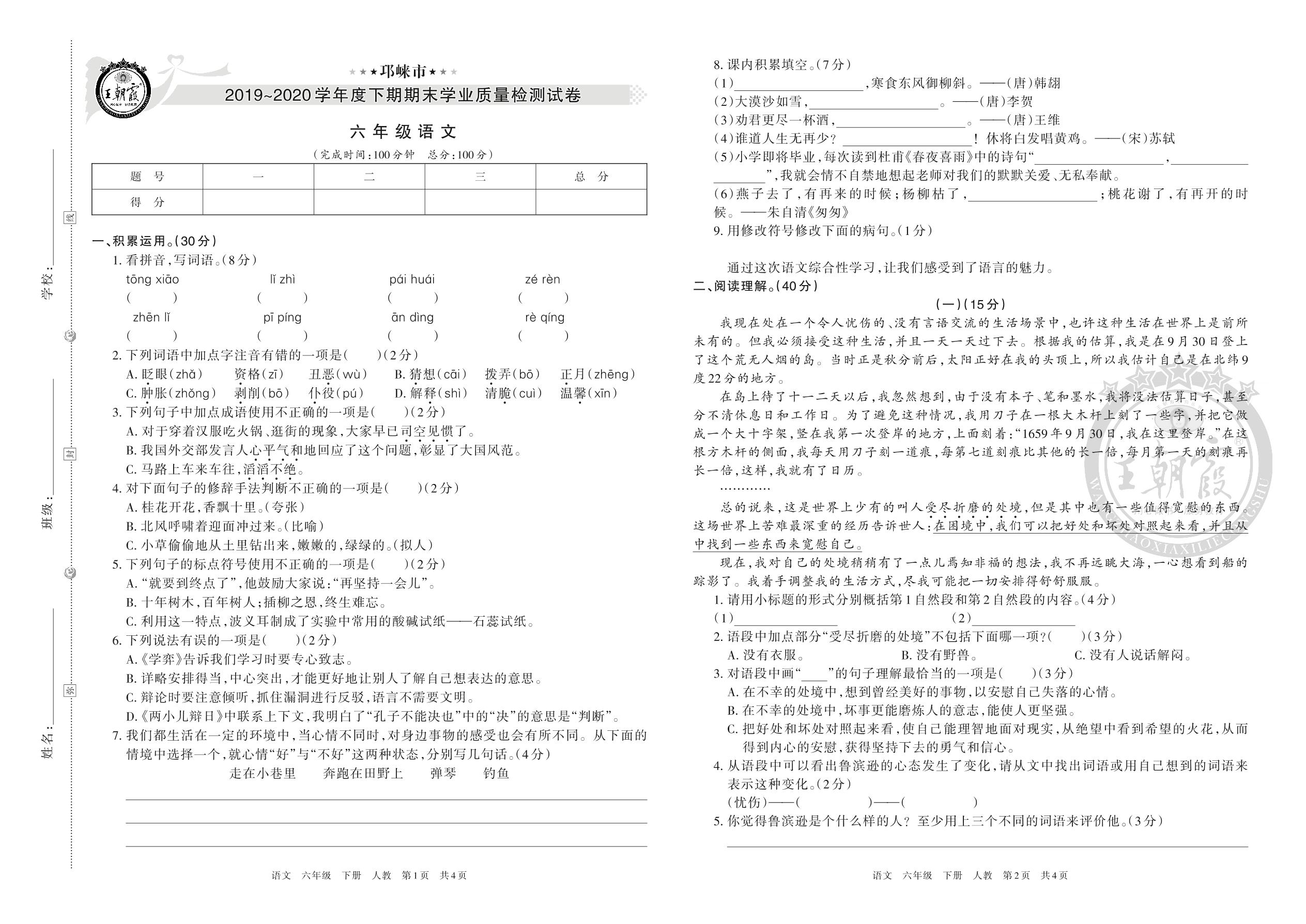 邛崃市2019~2020学年度下期期末学业质量检测试卷六年级语文