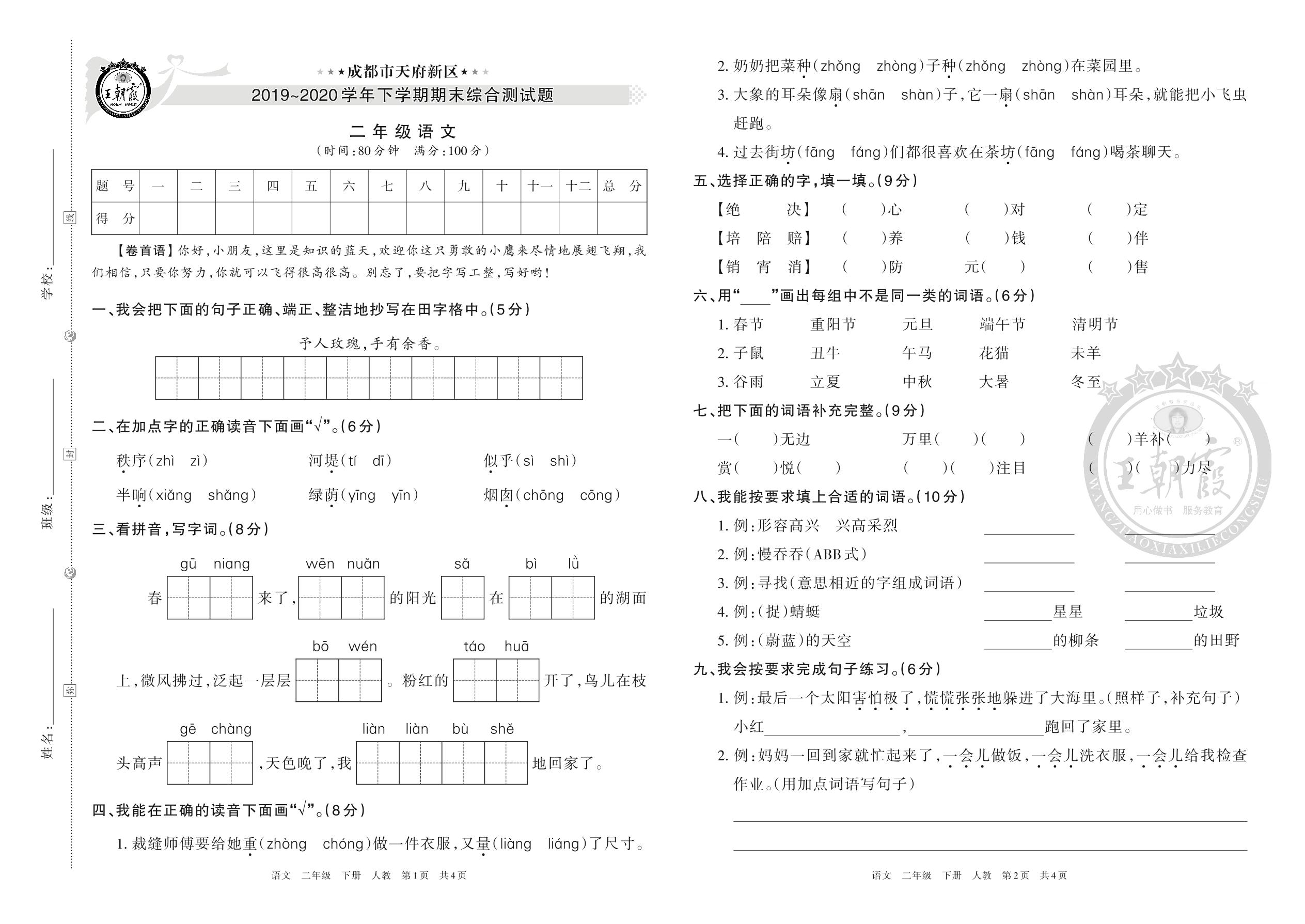 成都市天府新区2019-2020学年下学期期末综合测试题二年级语文