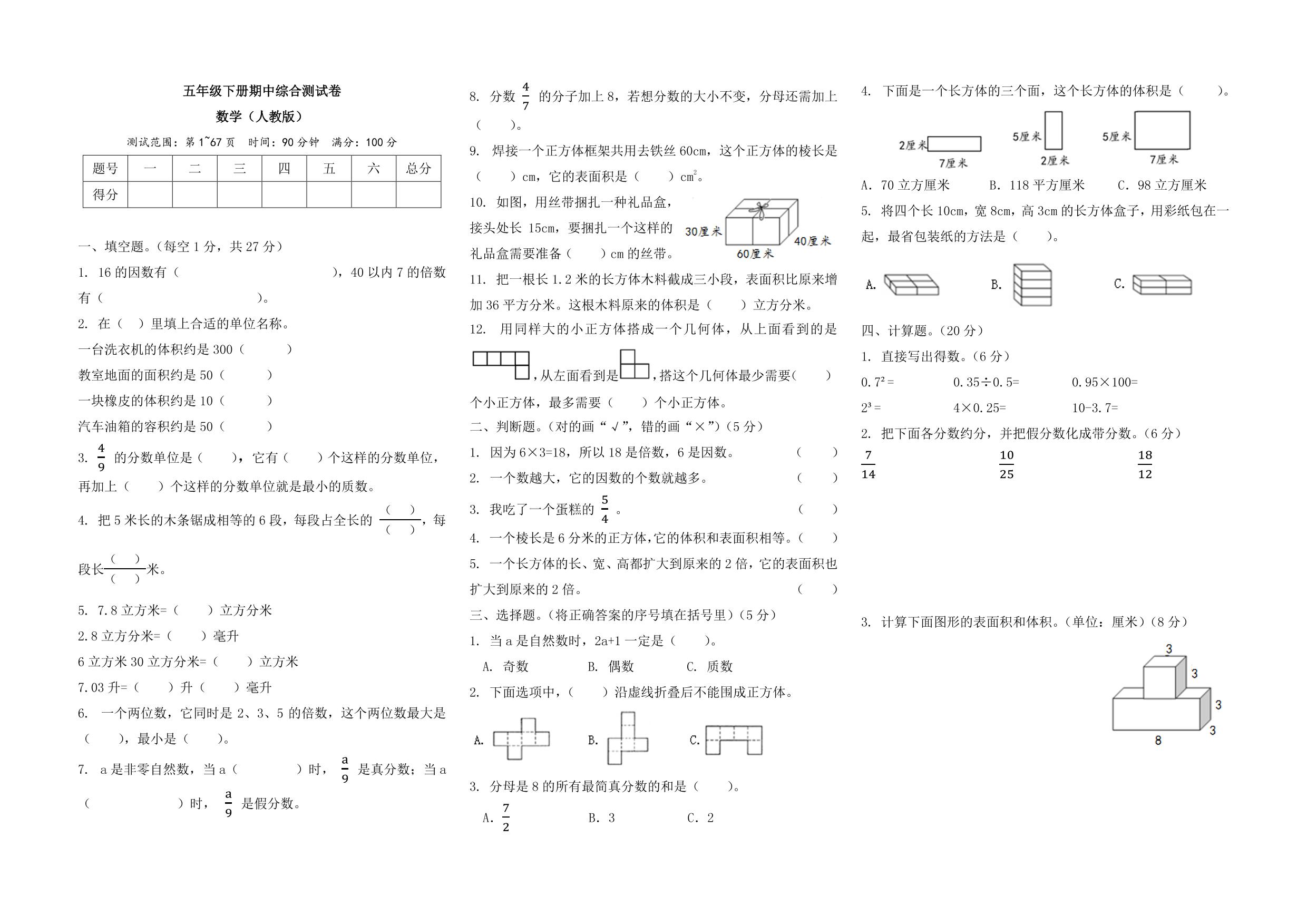 五年级数学人教版下册期中卷